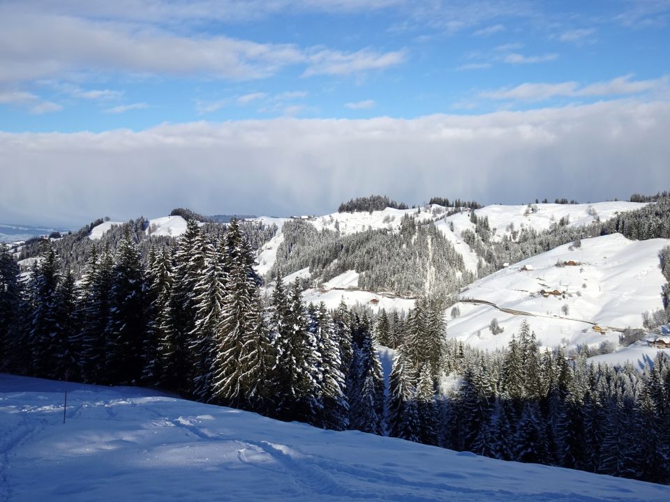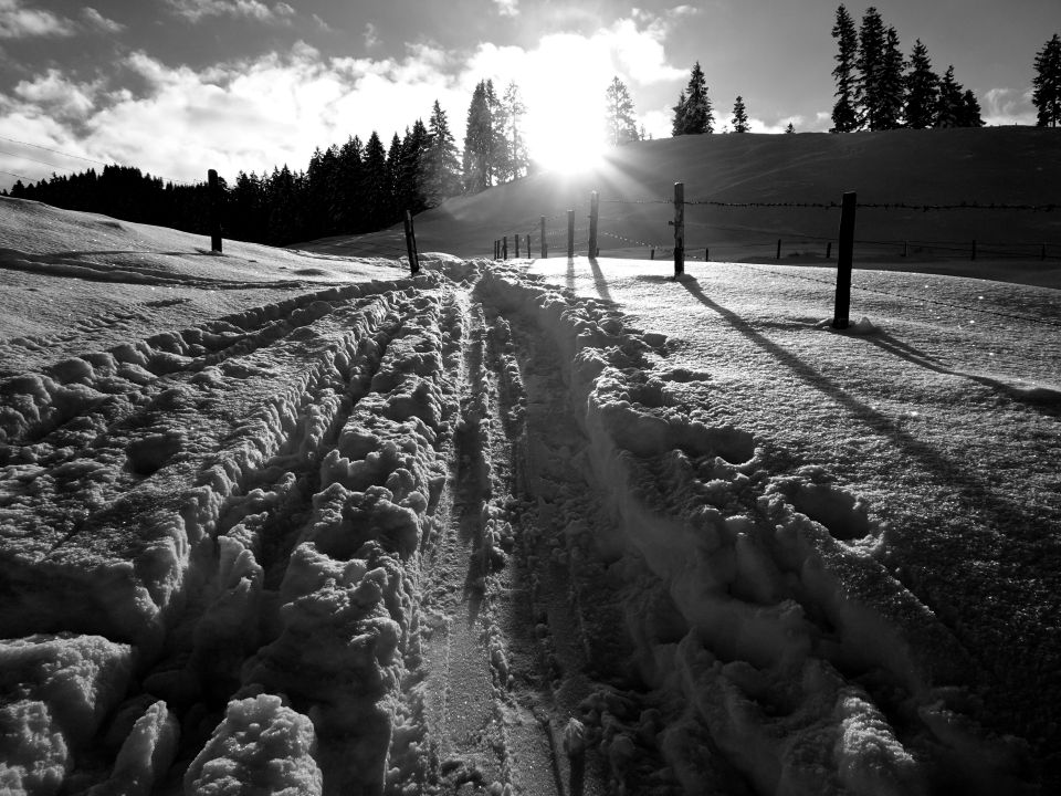 Route nicht vollständig gespurt Es hat Schneeschuh- Ski- und teilweise Fussspuren. Die Säge Seite ist teilweise mühsam aufgrund des abelagerten Schnee. Ob ich wollte oder nicht, habe ich die 7 Km. "geniessen" müssen. Den Skifahrern scheint es besser ergangen zu sein. Schneeschüeler haben ihre Schuhe manchmal ins Ungewisse (versteckte Löcher unter dem Schnee) gesetzt.