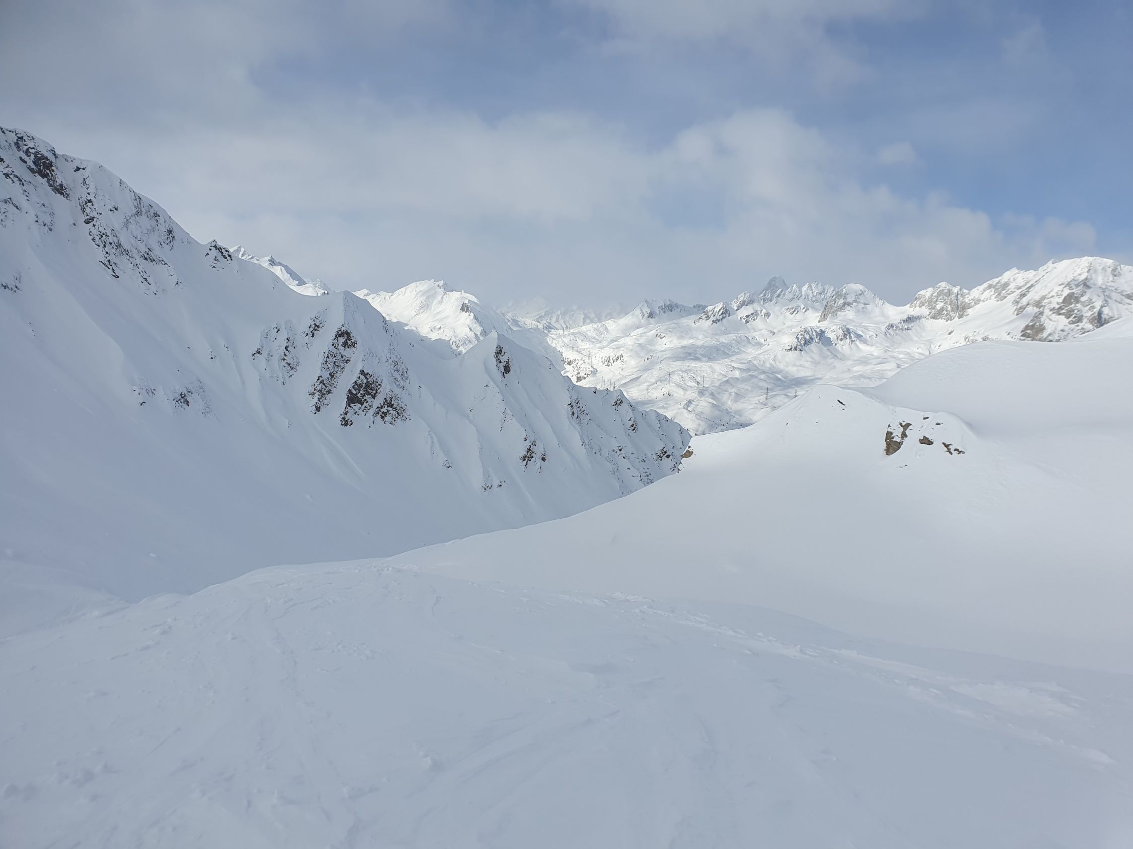 Von unten bis oben Powder. Im Gipfelbereich teils etwas windgepresst. Sonst fluffig auf guter Unterlage.