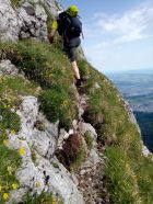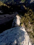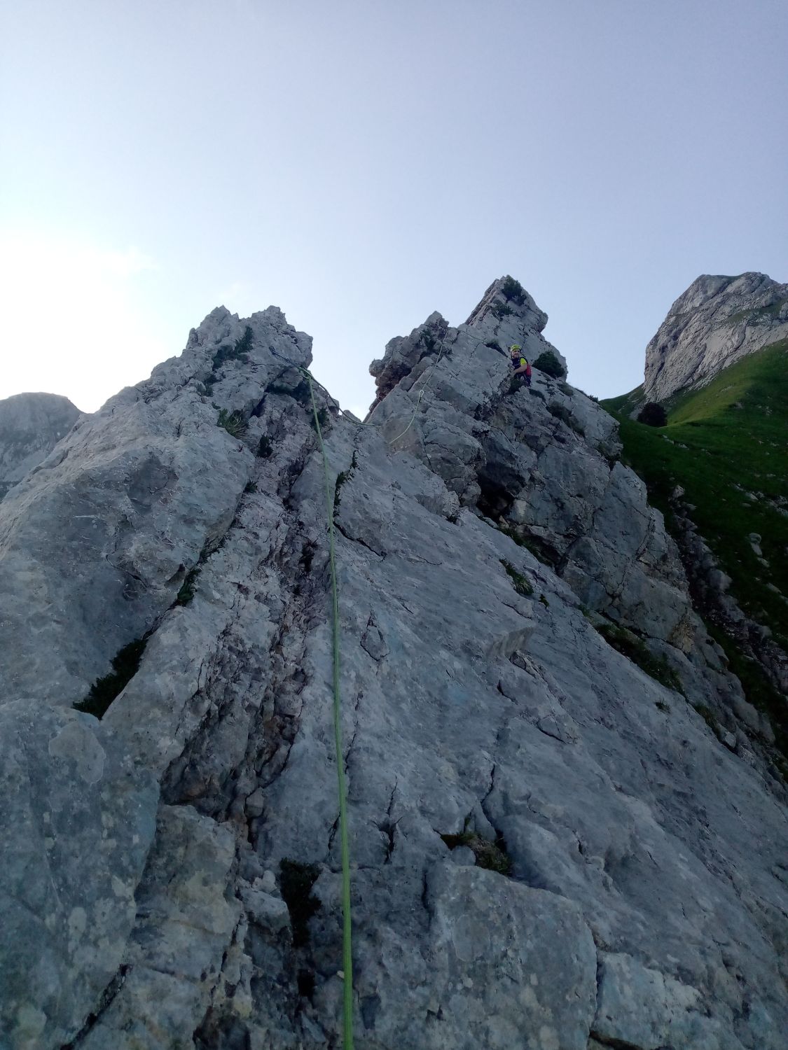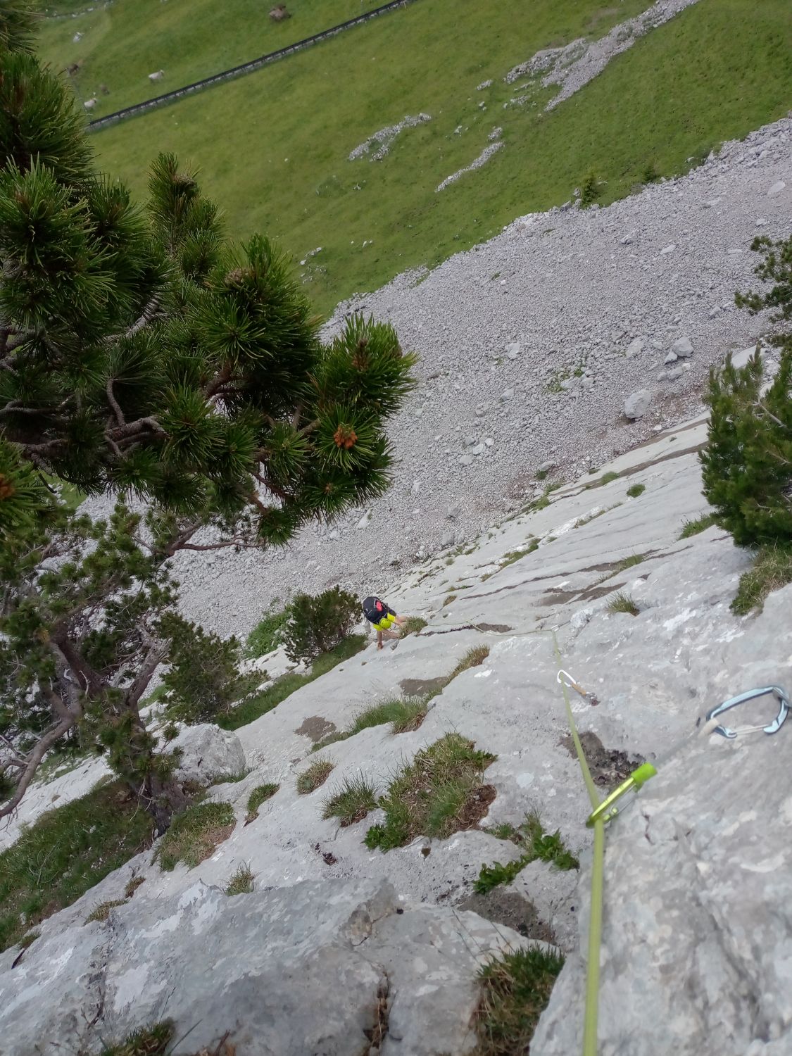 Um die Mattalpplatte zu durchklettern, wählten wir die Route Fadegrad (5c). Die Wasserrillen waren nass. So nass, dass wir sie in Bergschuhen kletterten. Mit Bergschuhen war die Reibung in den nassen Rillen bestimmt höher als in Kletterschuhen. Es gibt viele Routen in der Platte, wodurch die Wegfindung nicht gerade einfach ist. Am Schluss in leichter, aber weniger abgesicherter Kletterei durch den Wald, bis zum Einstieg der Galtigentürme. Folgt man dem markanten Band zu Beginn der Mattalpplatte, kann man den Einstieg auch zu Fuss erreichen. Wir kletterten den ersten Turm bei Abendlicht. Danach bauten wir auf dem Graskamm dahinter unseren Biwakplatz auf. Um 6 Uhr morgens nahmen wir die restlichen Türme und die Esel Ostwand in Angriff. Am vierten Turm war der Fels feucht, weshalb wir hier etwas mehr Zeit benötigten. Wieder einmal zeigt sich, dass man, wenn man antizyklisch unterwegs ist, dem Massenandrang auch bei viel begangenen Touren ausweichen kann.