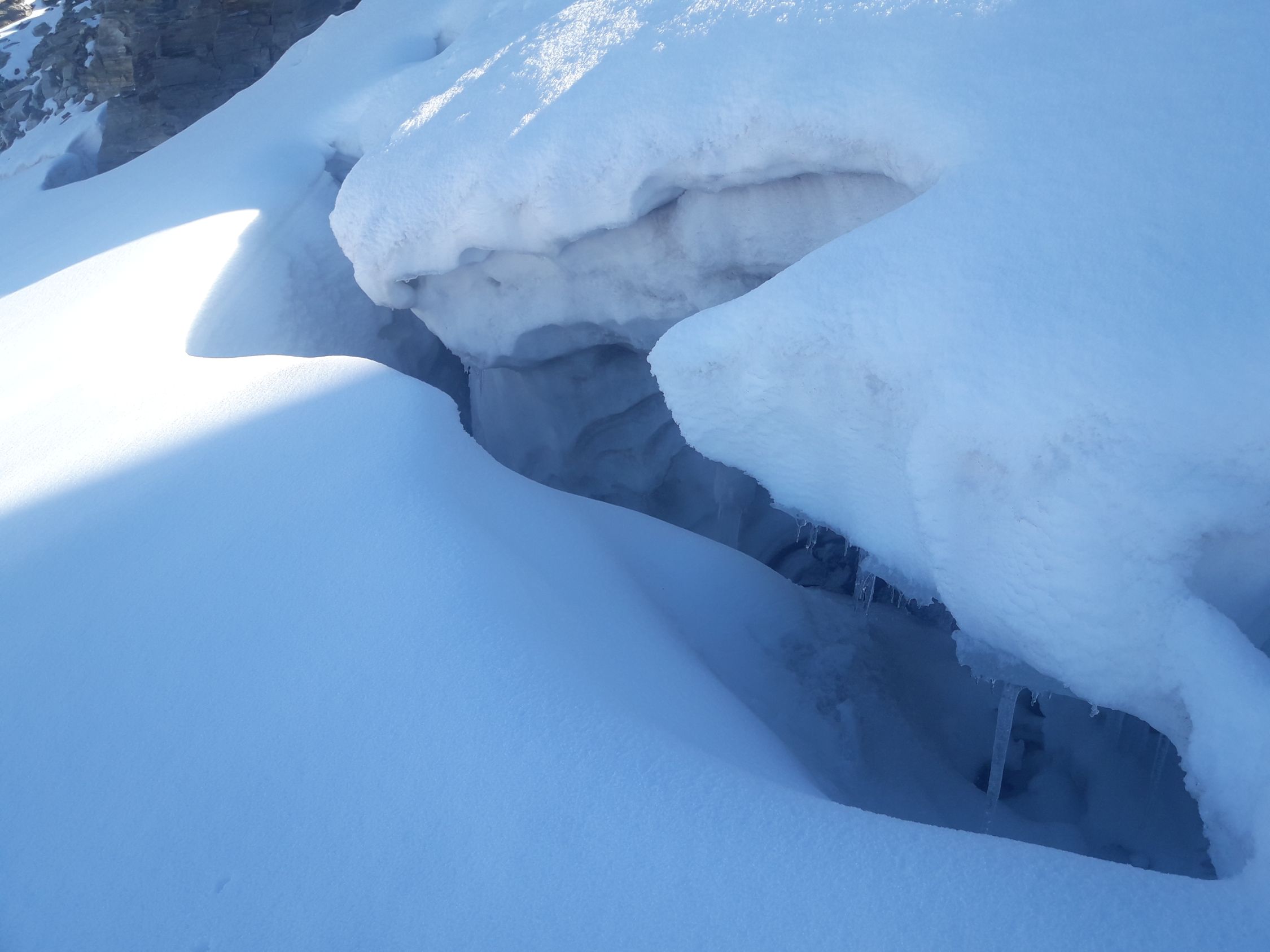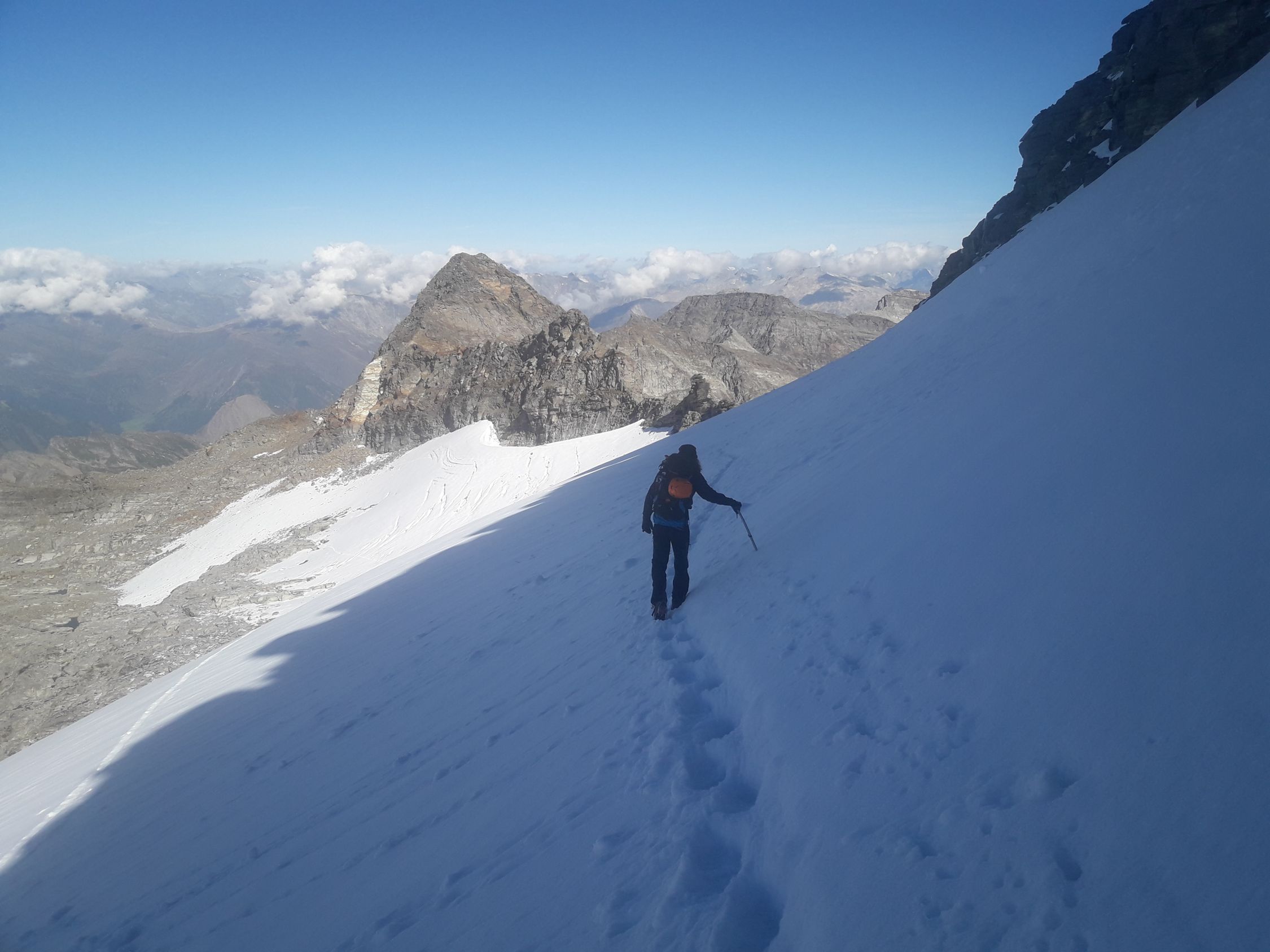 Überschreitung Rheinwaldhorn mit Biwak am Passo del Laghetto. Die Route ist mit blauen Punkten markiert, wodurch sich die Wegfindung von selbst erklärt. Wir hatten kein Seil für den Abstieg über den Gletscher dabei. Es sind einige Spalten vorhanden, anseilen ist also auf jeden Fall empfehlenswert.