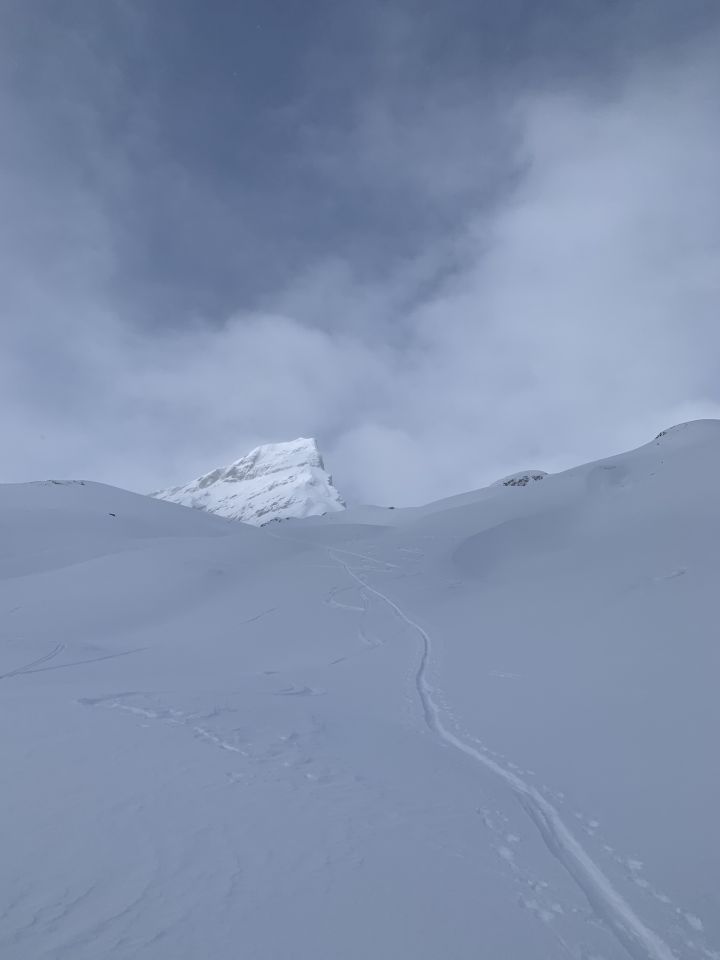 Pfeifend kalt aber genügende Unterlage und schöner Powder. Bei der Abfahrt unter 2100 bis 1949 ziemlich viel verblasen und wenig Unterlage. Wetter war überraschend top!!!