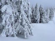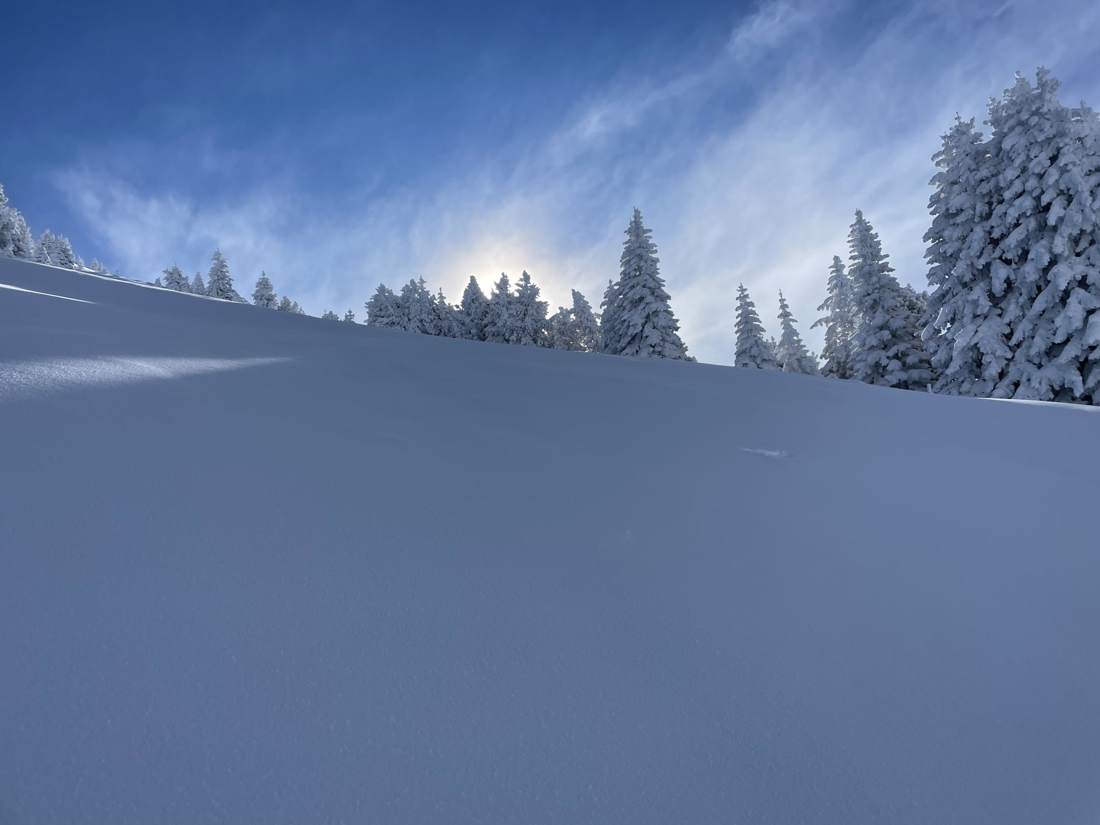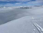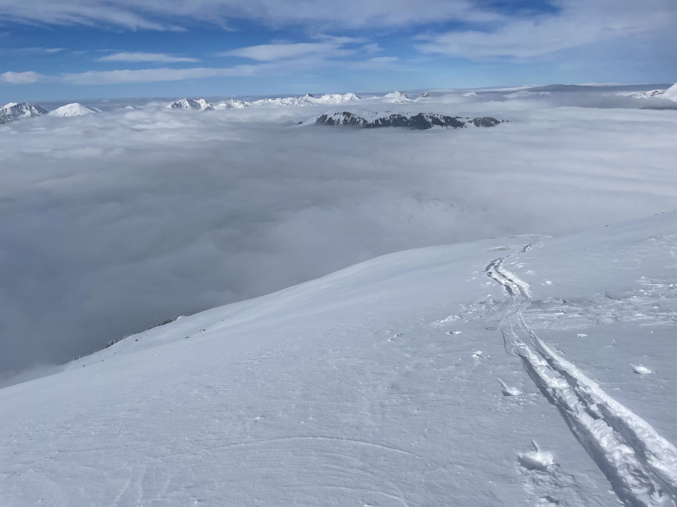 Ab Nüegg eine Nebelige Sache mit viel Pulverschnee. Ab Punkt 1737 gehts wie üblich rechtshaltend im wald hoch. Hier liegt viel Sturmholz und die Erlen sind zuwenig eingeschneit. Sprich eine äusserst mühsame Angelegenheit bis ca 1900 Meter. Gipfelhang aber gut machbar und hier super Sonnenschein. Abfahrt in der Mulde wo der Schnee liegt. Übergang rtg homad abgeblasen und keine unterlage. Der Ski ist entsprechend gezeichnet.