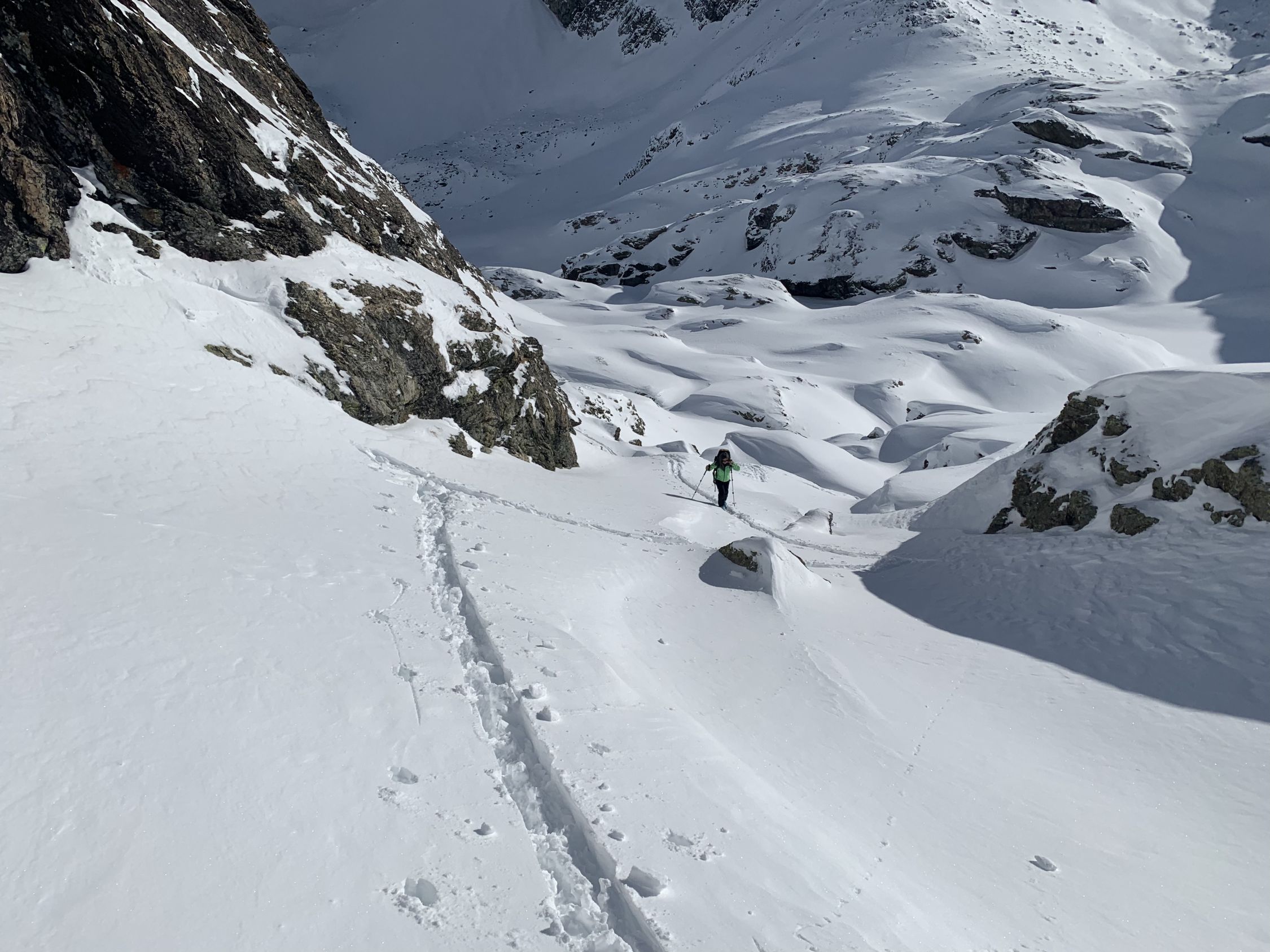Start um 08:30 bei -14 Grad und leichter Wind. Der Aufstieg bis zum See problemlos im 15-20 cm lockerer Pulver. Nach dem See bis im Sattel neben dem Pkt. 2581 alle Mulden mit 50-80 cm Pulver gefüllt, ohne jegliche Unterlage, sonst wenig und windverblasener Schnee. Wir sind aus dem Sattel zur Julierstrasse abgefahren, auch hier alterniert bodenloser, nicht gebundener Pulver mit knapp bedeckten Steine. Aus meiner Sicht alles andere als genussvoll..
