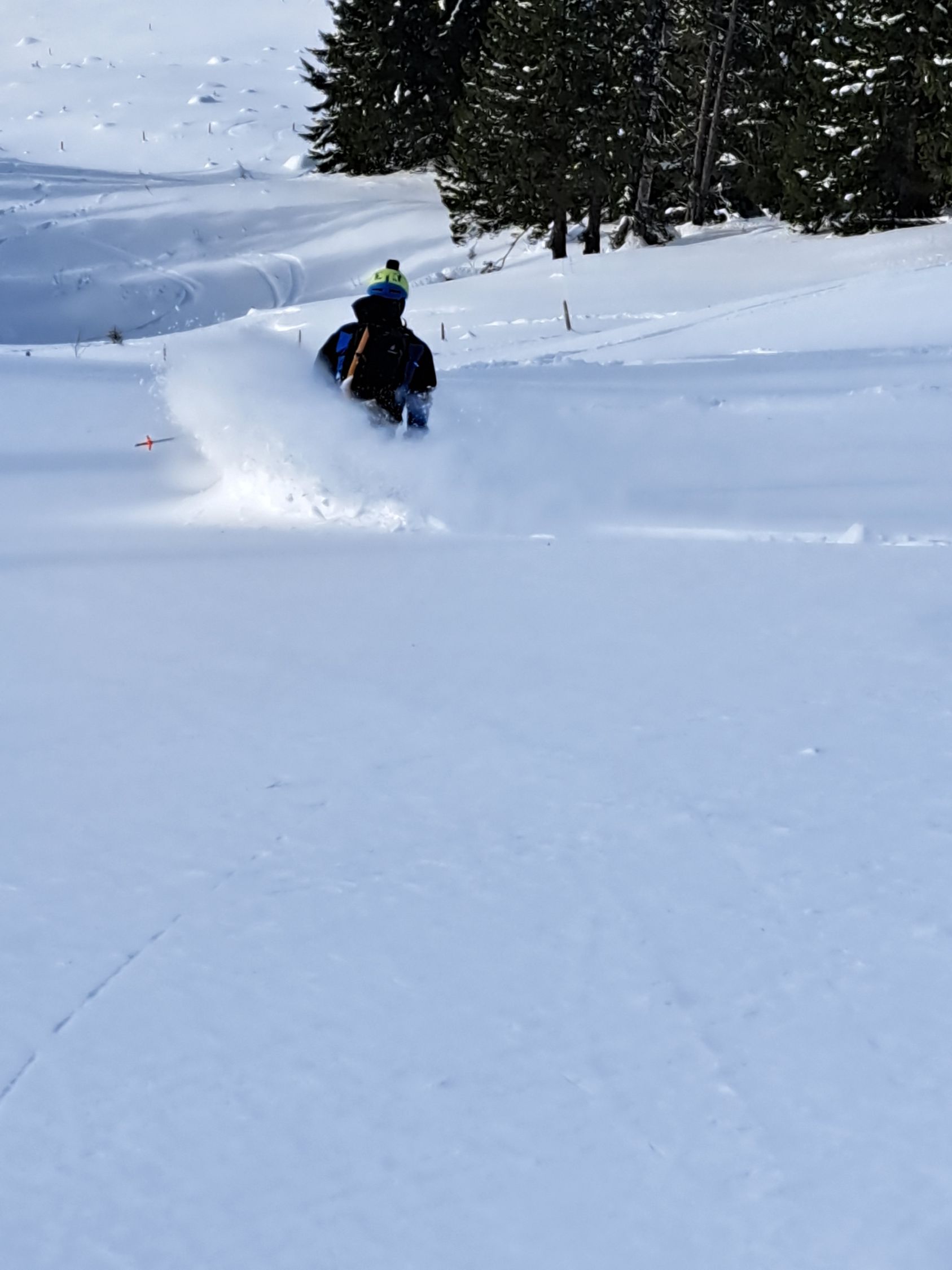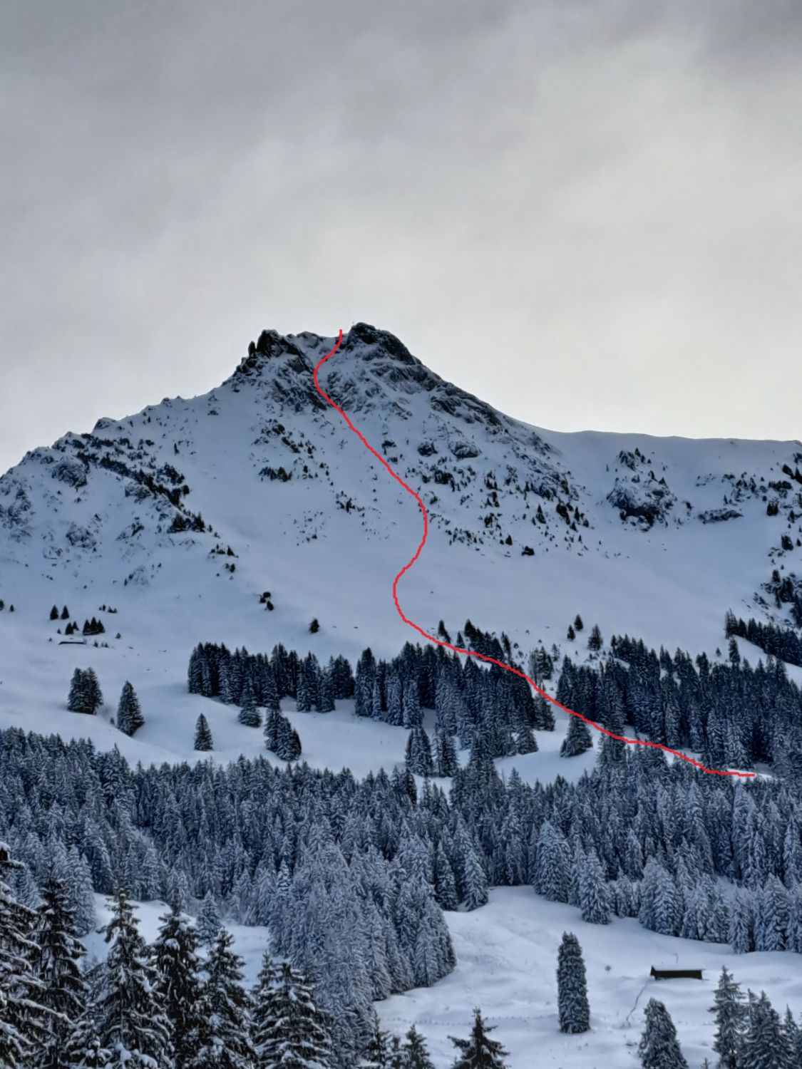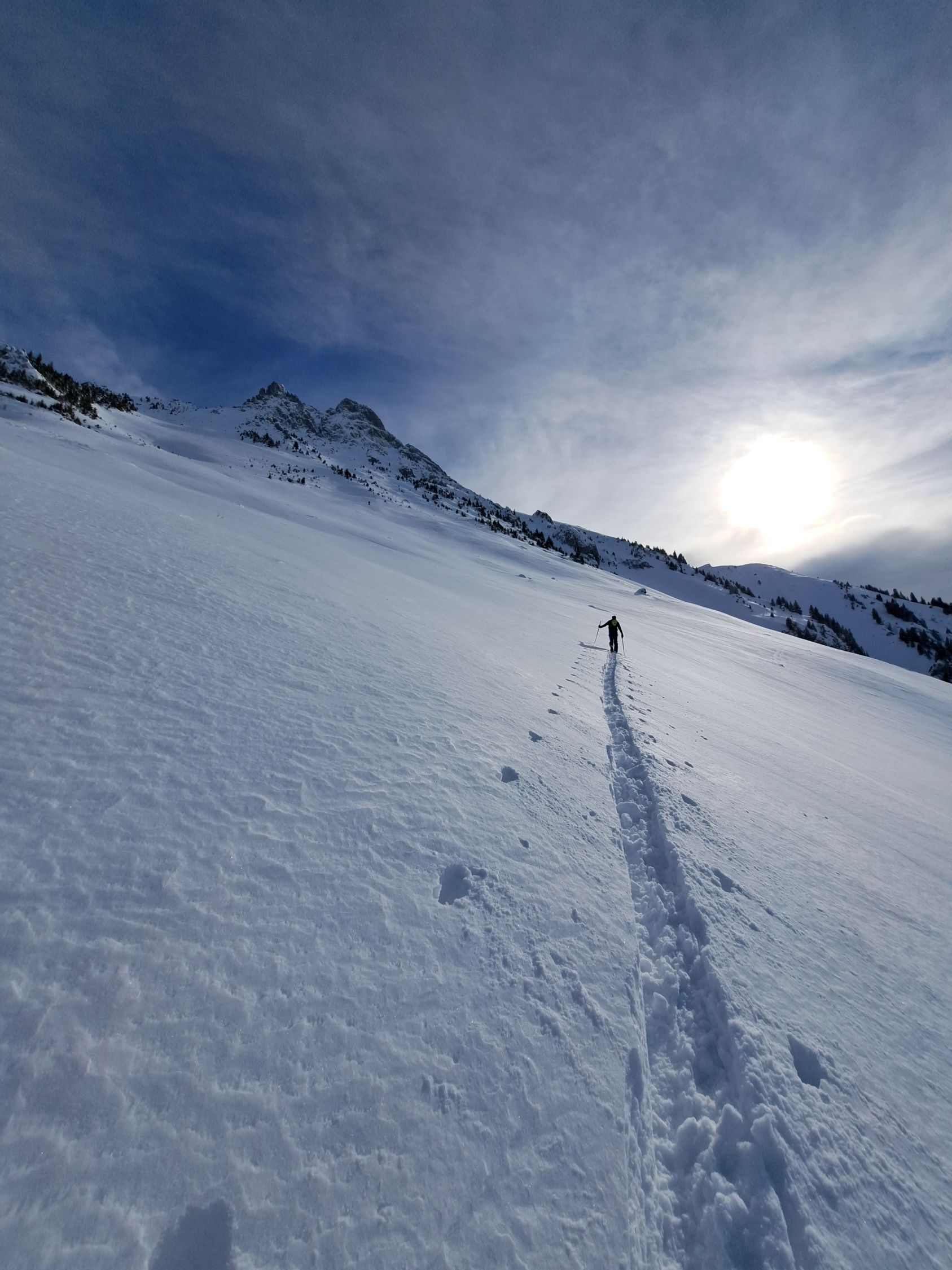 Genug Schnee von unten,ganze Flanke Pulver ohne Windeinfluss,da genug Schnee Aufstieg mit Ski bis vor Culi möglich.Dann kurzees Hüfttiefes Wühlen zu Fuss bis vor Gipfelaufschwung-leider komplett Schneefrei.Da keine Lust auf Steigeisen hoch und runter Abfahrt ab da in super Pulver mit einigen leichten Geräuschen unter Ski im Steilen,bis Waldschneise runter.Da noch mal Aufgefellt und hoch über Sommerweg auf Grat(1950m.) (weil ja schon gespurt...)