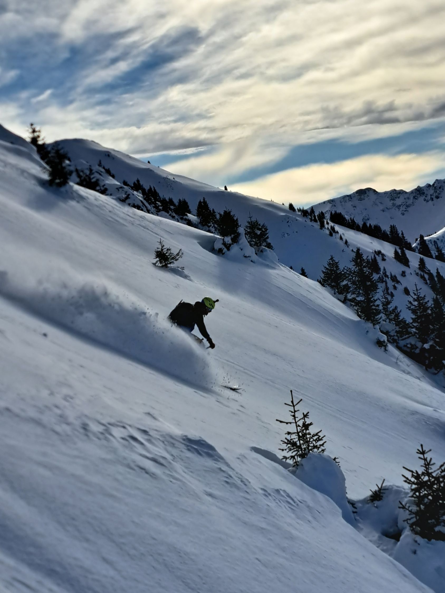 Abfahrt durch eine Mulde,Flanke unterhalb Wegweiser in Oberhammersupertoppulver in den Abend rein....ohne Geräusche diesmal.