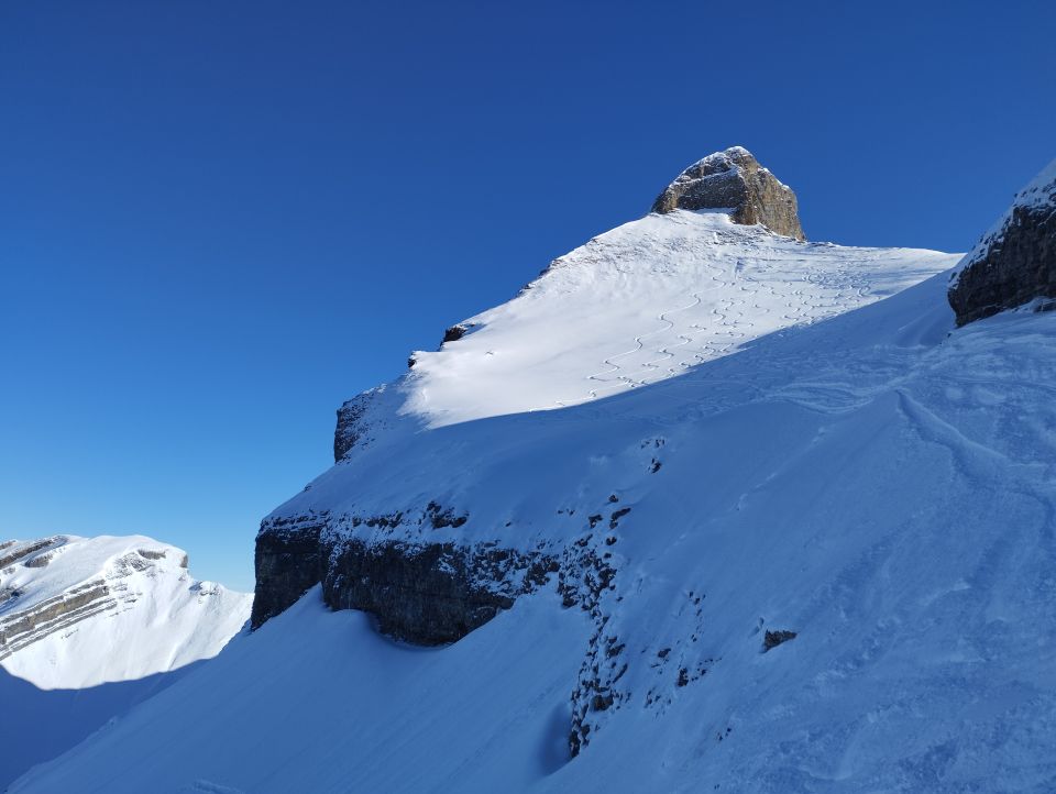Schneeschuhtour ab Weglosen zum Druesberg und Forstberg. Alles gut gespurt und grundsätzlich gute Verhältnisse. Aufstieg zum Forstberg problemlos. Auf dem Druesberg waren allerdings noch nicht viele, die Meisten steigen bis zum Skidepot und starten dort ihre Abfahrt. Ein Vorgänger hat heute bereits eine Spur gelegt. Guter Trittschnee ist aber etwas anderes. Der Aufstieg zum Druesberg ist nicht zu unterschätzen und Steigeisen/Pickel vorallem in der exponierten Traverse im Nordhang sehr empfehlenswert. Der Schnee am Gipfelgrat war aufgrund der tageszeitlichen Erwärmung schon recht aufgeweicht, weswegen ich jeden Schritt langsam und überlegt setzte. Viel Zeit verbrachte ich dort oben nicht, da ich mich zügig an den Abstieg wagen wollte, was dann auch besser klappte als erwartet. Ein "machbar" wäre für diesen Fussaufstieg eher passend. Etwa 30 Minuten später, als ich mich im Aufstieg zum Forstberg befand, löste sich in der Südflanke vom Druesberg eine kleine Lockerschneelawine. Auf der Route war die Stelle zum Glück nicht, hinterließ aber dennoch ein etwas mulmiges Gefühl. Abgesehen davon gute Bedingungen, es waren einige Leute unterwegs und die Gegend ist dementsprechend verspurt.