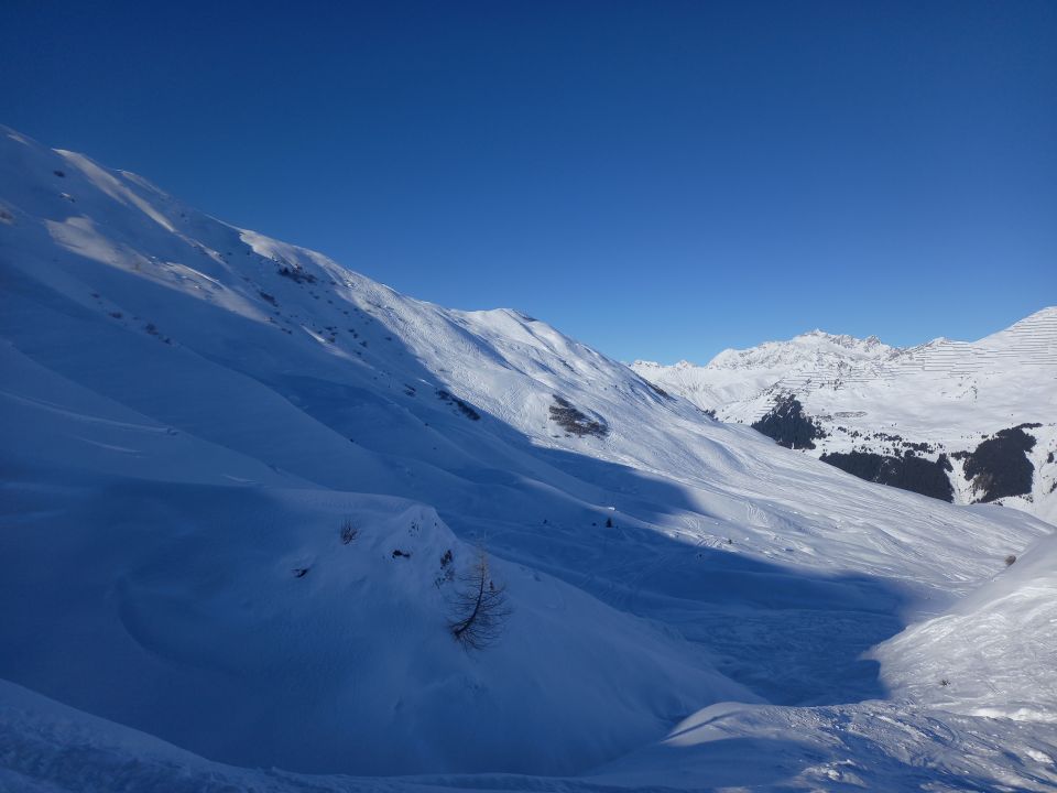 Abfahrt gleich wie Aufstieg, Schnee pulvrig aber schon arg zerfahren, gut fahrbar, es sind keine Steinkontakte zu befürchten. Bei 1800m auf dem Eggbergweg nach Litzistafel und auf dem Sommerweg zurück nach Dörfji, auf der Strasse bis zum Maiasässrank und dann über die Wiese nach Litzirüti, stöckeln auf dem Trottoir bis Platz.