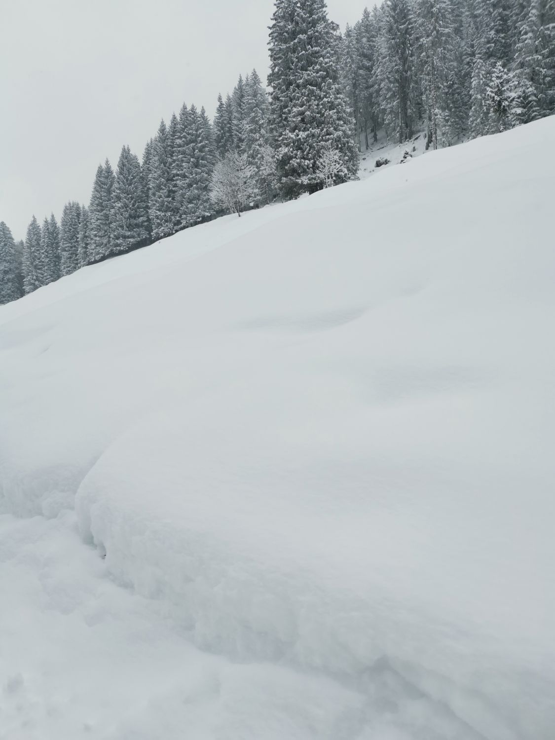 Wenig Unterlage, oben ca. 30cm Pulverschnee aber gut fahrbar durch weichen Untergrund, leider schlechte Sicht