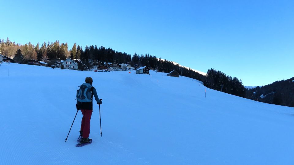 Bei der Ankunft in der Walenseeregion ließen wir den Hochnebel hinter uns. Bei wolkenlosen Verhältnissen und -6 Grad sind wir in Arvenbüel zur Schneeschuhtour aufgebrochen. Zuerst auf der Piste, dann auf dem Winterwanderweg zur Vorder Höhi. Die Schneeschuhroute lag noch mehrheitlich im Schatten, weshalb wir sie erst auf dem Rückweg nahmen.