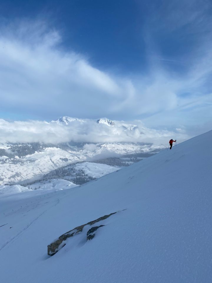 10-20 cm powder along the ascent from the meadow to the forest and the long slope until the summit but without significant base, many rocks and stones contacts on the way up and down (I stopped counting).