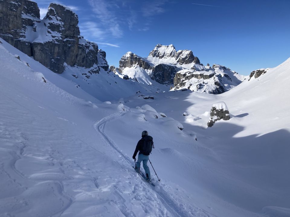 Die Kälte hat den Schnee bestens konserviert. Ein herrlicher Pulverschnee liegt vor allem in den schattigen Hängen bereit. Obwohl recht gut eingeschneit, kann Steinkontakt nicht ausgeschlossen werden. Selbst auf dem flachen Teil zum Glatten liegt genügend Schnee. Für die Abfahrt ab Gross Gade lohnt es sich die Alpstrasse zu nehmen.