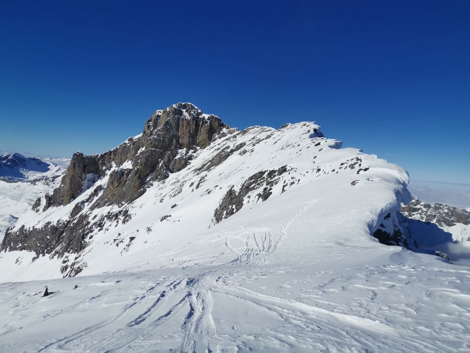 Im unteren Bereich ab Tannalp noch einige Steine sichtbar. Sonst mit etwas Vorsicht kein Steinkontakt. Schnee wechselte von Pulverschnee in den Mulden zu windgepressten Pulver. Gipfelhang war ganz schön zum Fahren. Allgemein etwas windig heute. Hochnebelgrenze bei 2000müM. Oben schön sonnig.