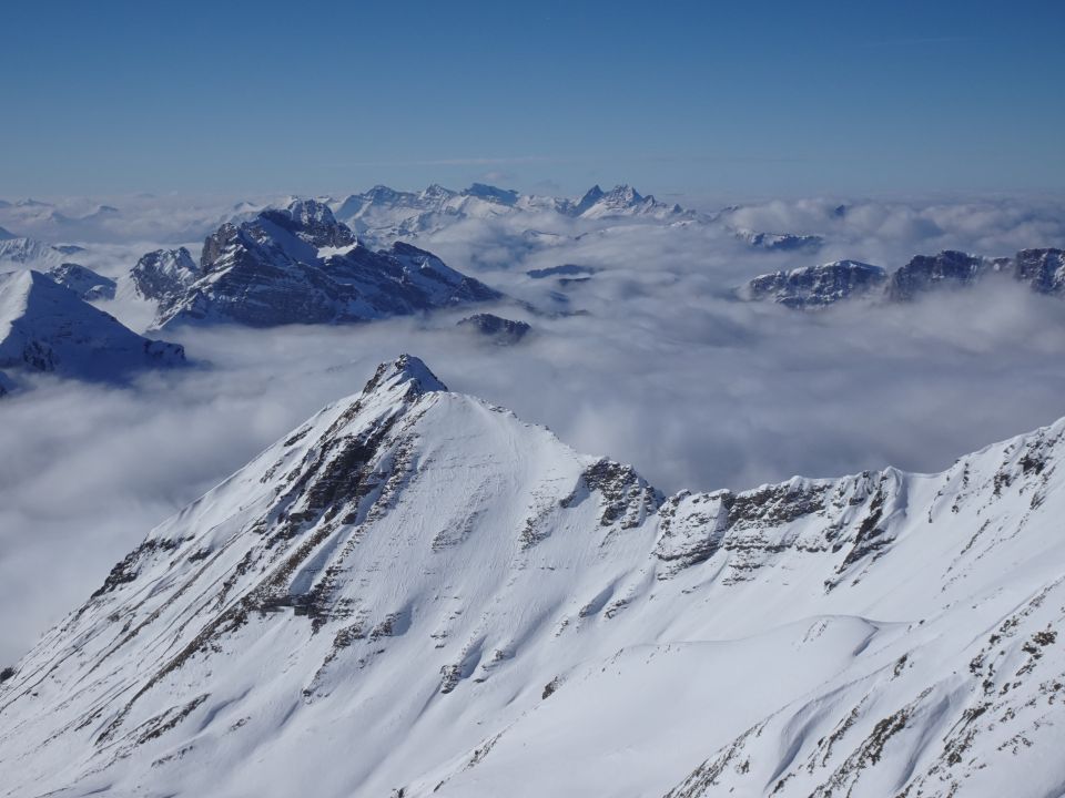 Ab Schiessplatz bis Gipfel 20-30cm Pulverschnee der im Aufstieg zum teil einen Winddeckel und in den obersten 50 Hm total Windbearbeitet und hart ist.