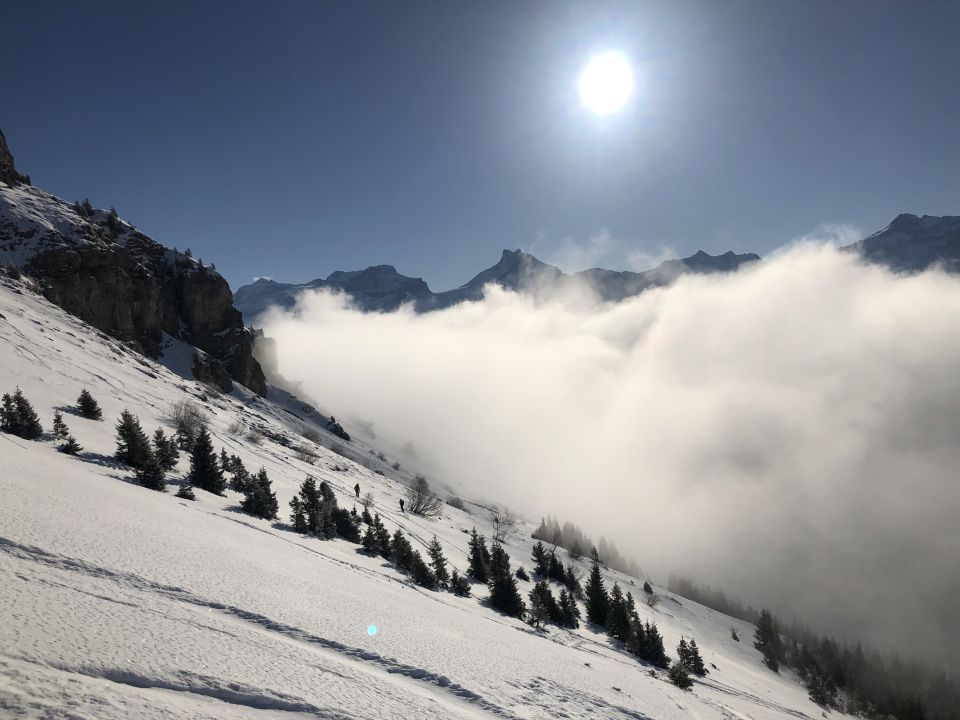 Abfahrt direkt über die südostflanke in gut gesetztem pow. Kurzer gegenanstieg, danach wiederum meistens sehr guter pulver bis in den talboden. Unter 1800 lohnt es sich aber etwas umsichtig zu fahren.