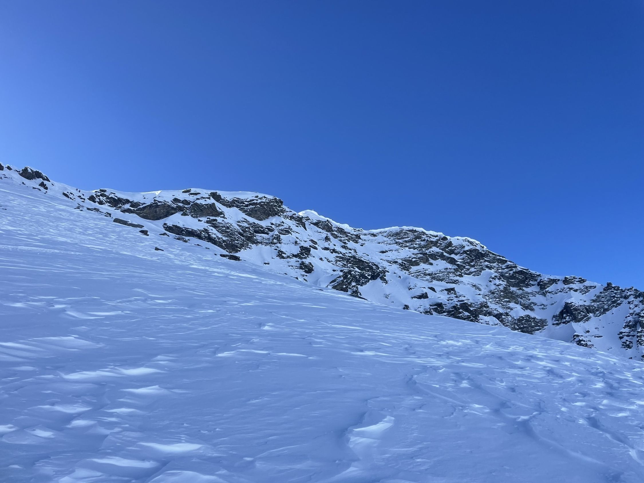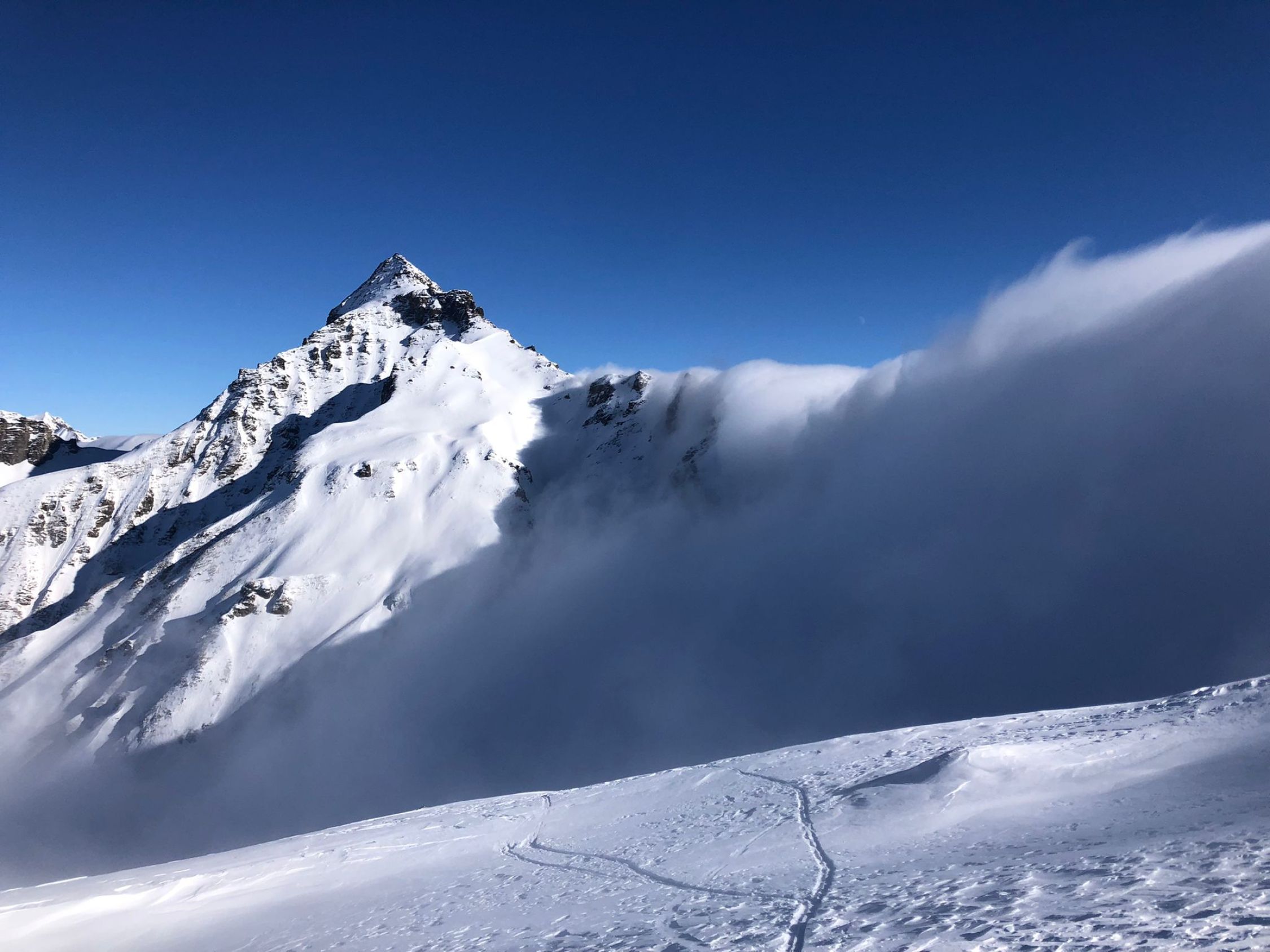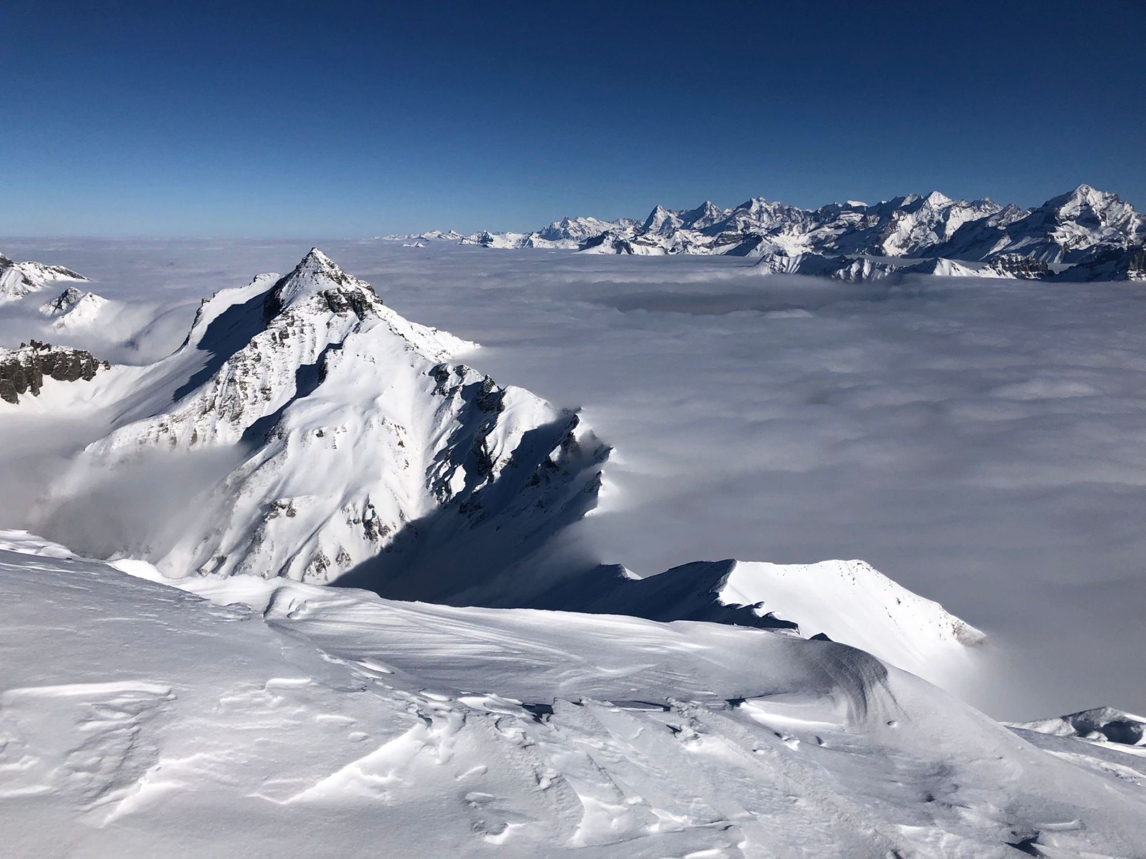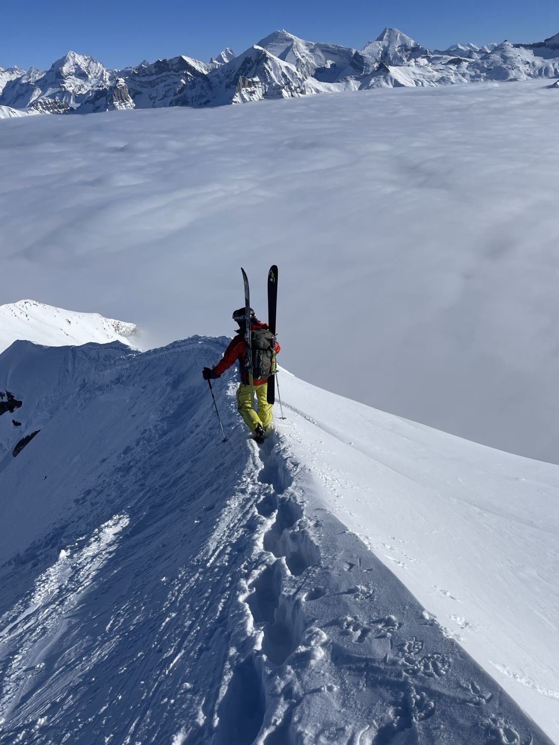 Mehrere gute Spuren bis zum Sattel. Wir haben aufgebunden sowohl beim Aufstieg als auch im Abstieg. Geht aber auch mit Ski. Ansonsten wechselnde Schneeverhältnisse von Presspulver, Winddeckel, Pulver, Hart alles dabei. Aber besser als ich im Aufstieg gedacht habe. Grossartig war heute v.a. die Szenerie mit Fallwind und zugehöriger Wolke über den Col. Daher auf der Normal route Blindflug bis kurz vor den Aufstieg auf den Grat. Ab dann grand bleu mit Sicht aufs Nebelmeer.