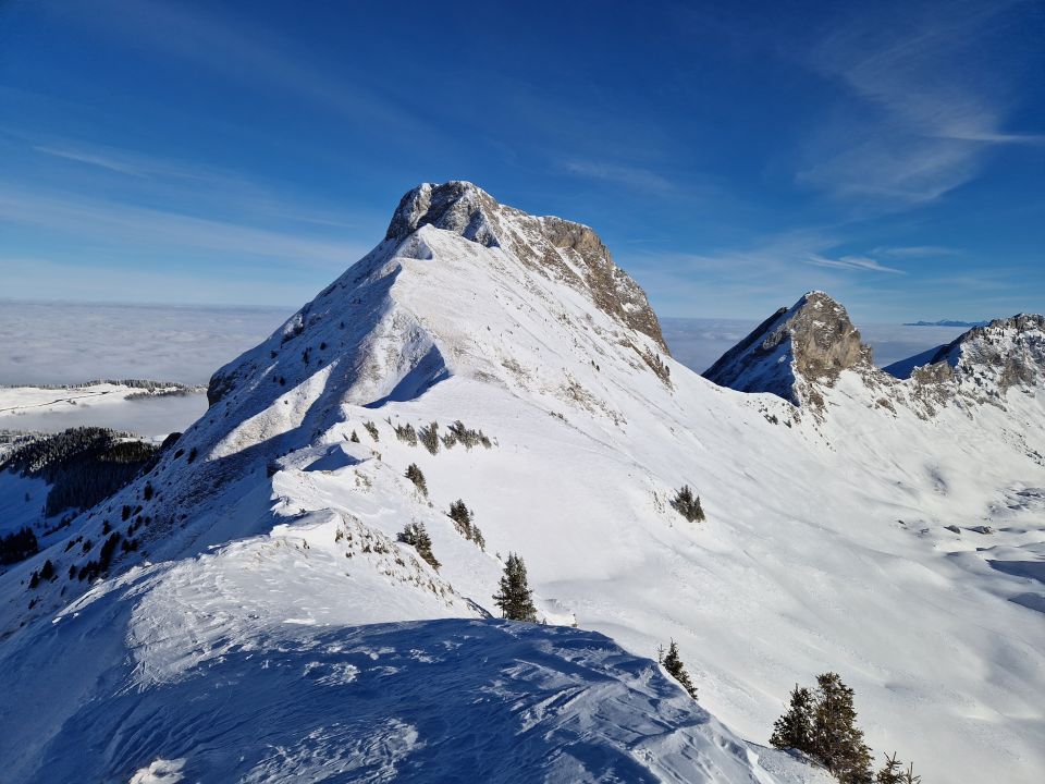 Wir wollten eigentlich auf den Gantrisch, auf dem Schibenspitz haben wir entschieden durch das erste Couloir nach dem Bunker zu fahren, da die Südseite des Gantrisch sehr wenig Schnee hat. In der Abfahrt hat es vorwiegend tragenden Presspulver und ab und zu auch noch etwas Wanderarbeiteter Pulver. Heute waren sehr viele Leute im Gebiet