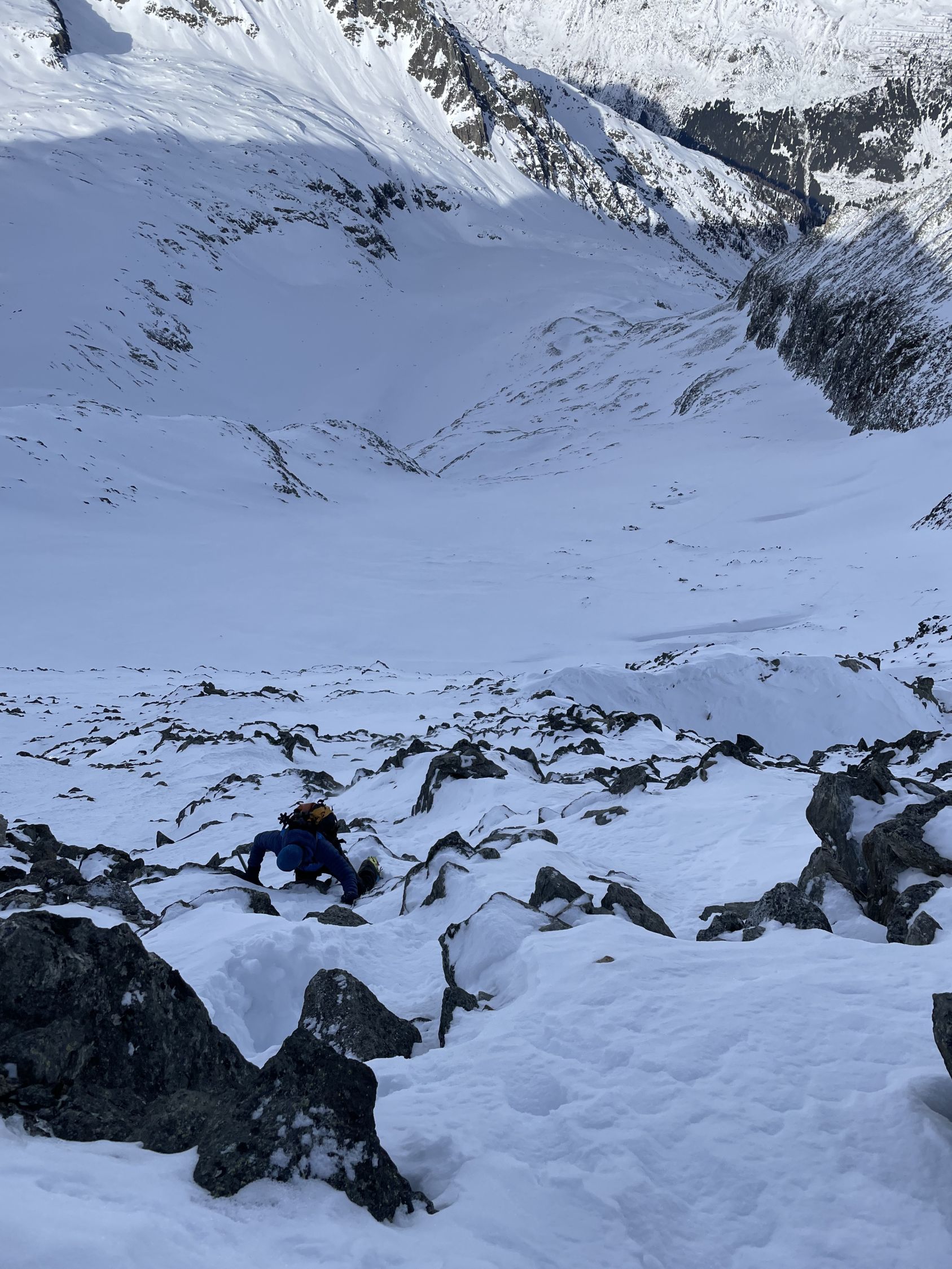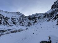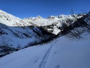 Im Aufstieg haben wir die Skitourenguru-Variante links vom Mühletobel gewählt, Ski tragen im Wald. Auch im Kartigelkessel sind wir links des Bachs geblieben statt rechts auf die eigentliche Aufstiegsroute. Unter dem etwas mehligen Schnee teilweise vereiste Felsen. Steigeisen unerlässlich. Der mehlige Schnee wechselt erst nach den Erlenbüschen in Pulver. Stellenweise leichter Bruchharsch. Keine Spuren, offenbar waren wir in diesem Jahr die ersten. Ab Skidepot wieder ziemlich mehliger Schnee bis zum Gipfel, guter Trittschnee sieht anders aus. Auch im Abstieg war Vorsicht angebracht. Abfahrt bis oberhalb Kartigelkessel im Pulver, teilweise windgepresst, aber überall sehr knapp, Steine lauerten überall. Deshalb mussten wir im Kartigelkessel zwischen den Erlen abfahren, dort nur wenig Platz mit wieder mehligem Schnee. Hier ginge die SAC-Aufstiegsroute durch, wäre heute noch anstrengender gewesen als links vom Bach. Wanderweg ab Stäfeli bis nach Maien knapp fahrbar, sonst liegt zuwenig Schnee.