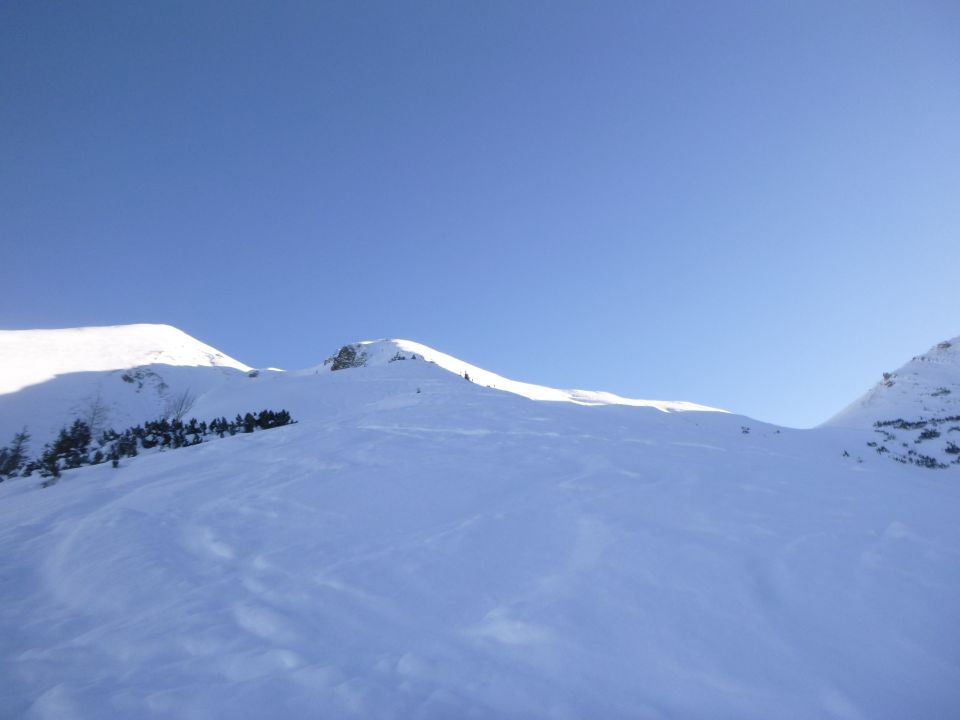 Tourenbeginn um 07:55 Uhr bei -11°C unter klarem Himmel. Skispur und eine kaum noch erkennbare SS-Spur waren vorhanden. Pulver-Neuschnee von vorgestern ca. 20 cm hoch. Der Südrücken war zwar stellenweise abgeblasen, aber selbst für die Skitourengänger ließen sich ausreichend Schneeflecken finden. Das Teersträßchen nach Bichlbächle war geräumt.