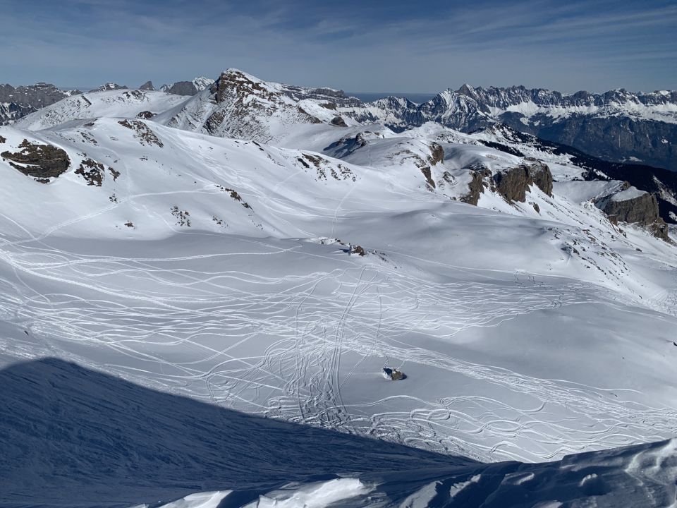 Unterhalb 2000m wenig Schnee, aber eine Abfahrt bis zur Alp Fursch ist mit umsichtigem Fahren keine Probleme. Pulverschnee in den Schattenhänge. Viel weniger Spuren als zur Spitzmeilen. Gipfel hat einen Wächtenriss. Irgend wann (Erwärmung) wird dieser brechen.