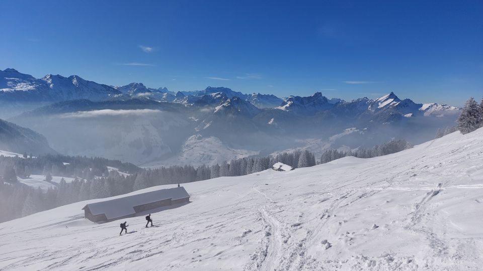 Im Aufstieg ab Bernhalden bis Risipass gute aber geringe Schneedecke mit Pulver. Im Gipfelhang geringe, verfestigte Schneedecke. Abfahrt nach Stein ruppig mit Bodenkontakt, aber machbar.