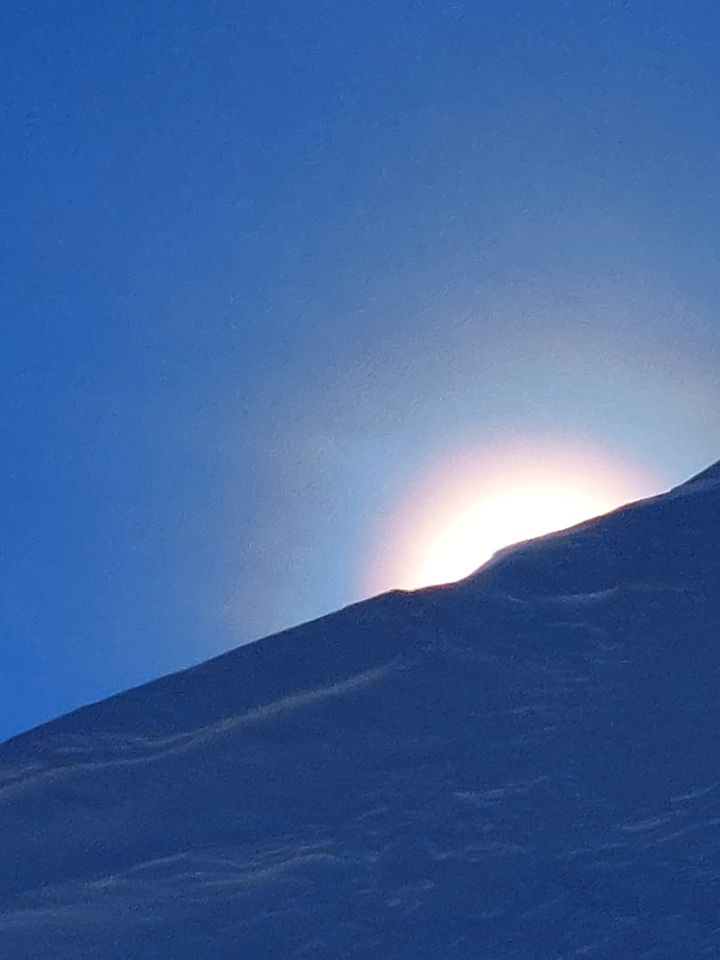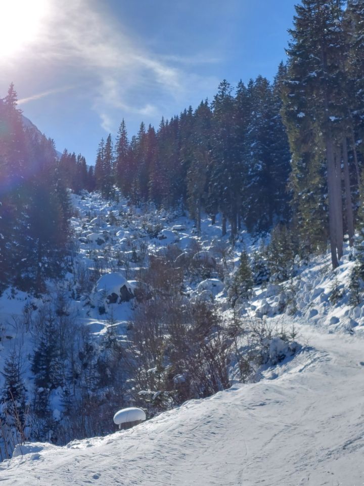 Abfahrt: Der Pulverschnee ist zum Teil windbearbeitet, aber noch gut zu fahren. Leider ist halt alles verfahren durch die vielen Tourengänger. Die Abfahrt auf dem Waldweg ist wie eine Skipiste und durchgehend schneebedeckt.