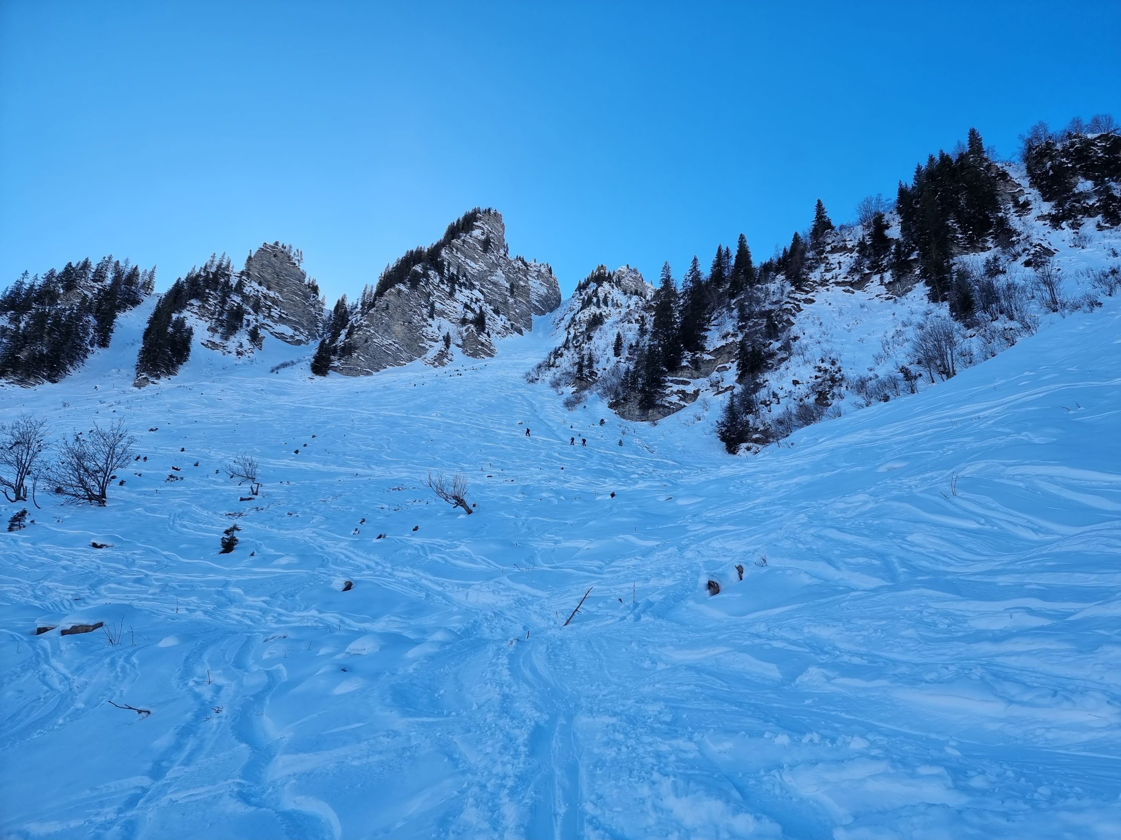 Inspiriert von Fädimäns Eintrag vom 29.1.2023 haben wir - wie in der Zwischenzeit sehr viele andere auch - Aufstieg und Abfahrt ebenfalls von Osten gewählt. Los um 11 Uhr bei -7° von Fieldrich auf guter, teilweise sportlicher und rutschiger Spur. Leider liegt zu dieser Jahreszeit praktisch alles im Schatten und es ist saukalt, dafür dank wenig (aber meist genügend) Schnee sehr mässige Lawinengefahr. 3.5 Stunden bis zum Gipfel. Abfahrt in wechselnden Verhältnissen ganz passabel, unten raus sind viele Steine nur knapp bedeckt. Es gab ein paar Pulverschwünge, aber leider ist das Meiste sehr zerfahren. Nach fünf Stunden zurück beim Parkplatz. Bei den aktuellen Bedingungen kann die Tour nur unter Vorbehalt empfohlen werden. Schön war's trotzdem.