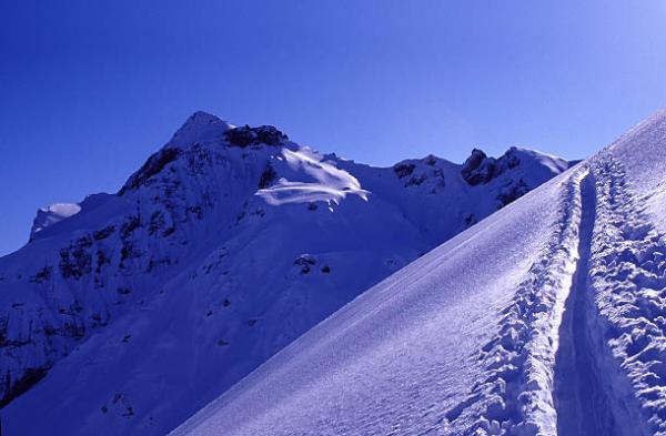 GS WS+; Von Gruebe (Färmeltal) über die Hänge von "i de Schufle" in guter Spur empor auf den Ostgrat. Ausgesetzte Übergangsstelle auf dem Grat gut begehbar. Weiter auf den Gipfel. Abfahrt über gleiche Hänge wie Aufstieg