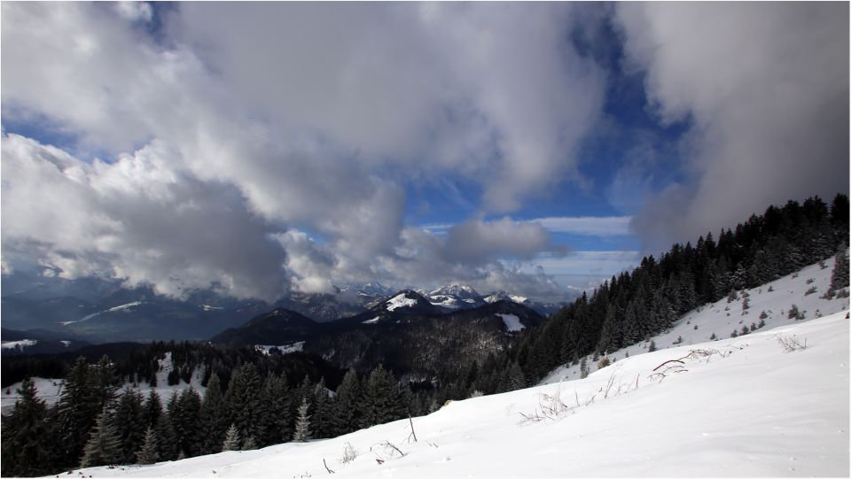 Blick in die Runde: Sofern man schmerzbefreit ist, was den Steinkontakt betrifft kann man in den umliegenden Bergen mit Skiern rumrutschen. Allerdings bricht man nach wie vor beinahe überall auf den Boden durch, Steine sind nicht ausreichend eingeschneit, man kratert also leicht ein. Besser wäre ggf. der Bereich um die Priener Hütte, weil Forstweg, aber es sind dort viele Schlittenfahrer unterwegs, Schnee dürfte im unteren Teil der Forststrasse deshalb gerade so reichen.