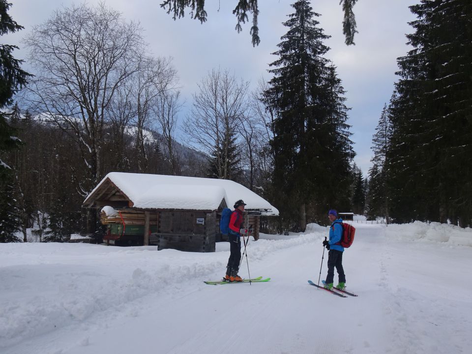 Wenn´s halbwegs kalt bleibt, obere Hänge noch eine Weile gut. Talabfahrt bei ungünstigen Schneeverhältnissen auf dem Alpweg.