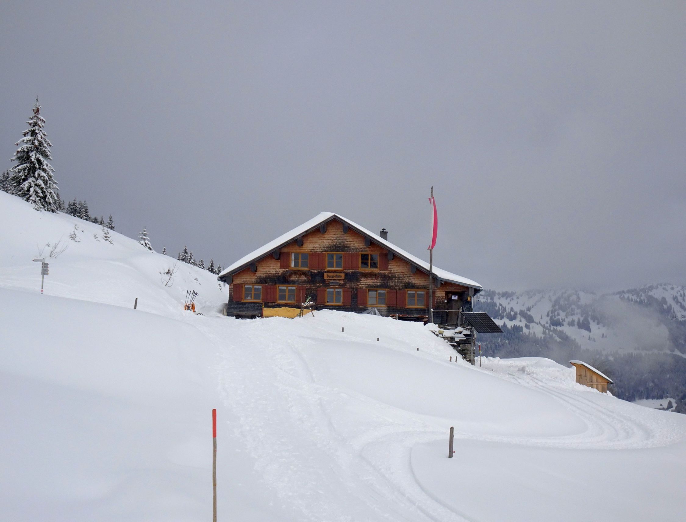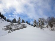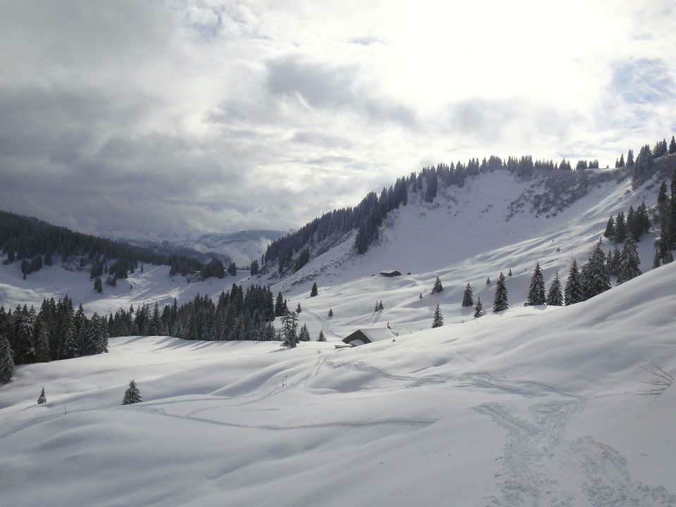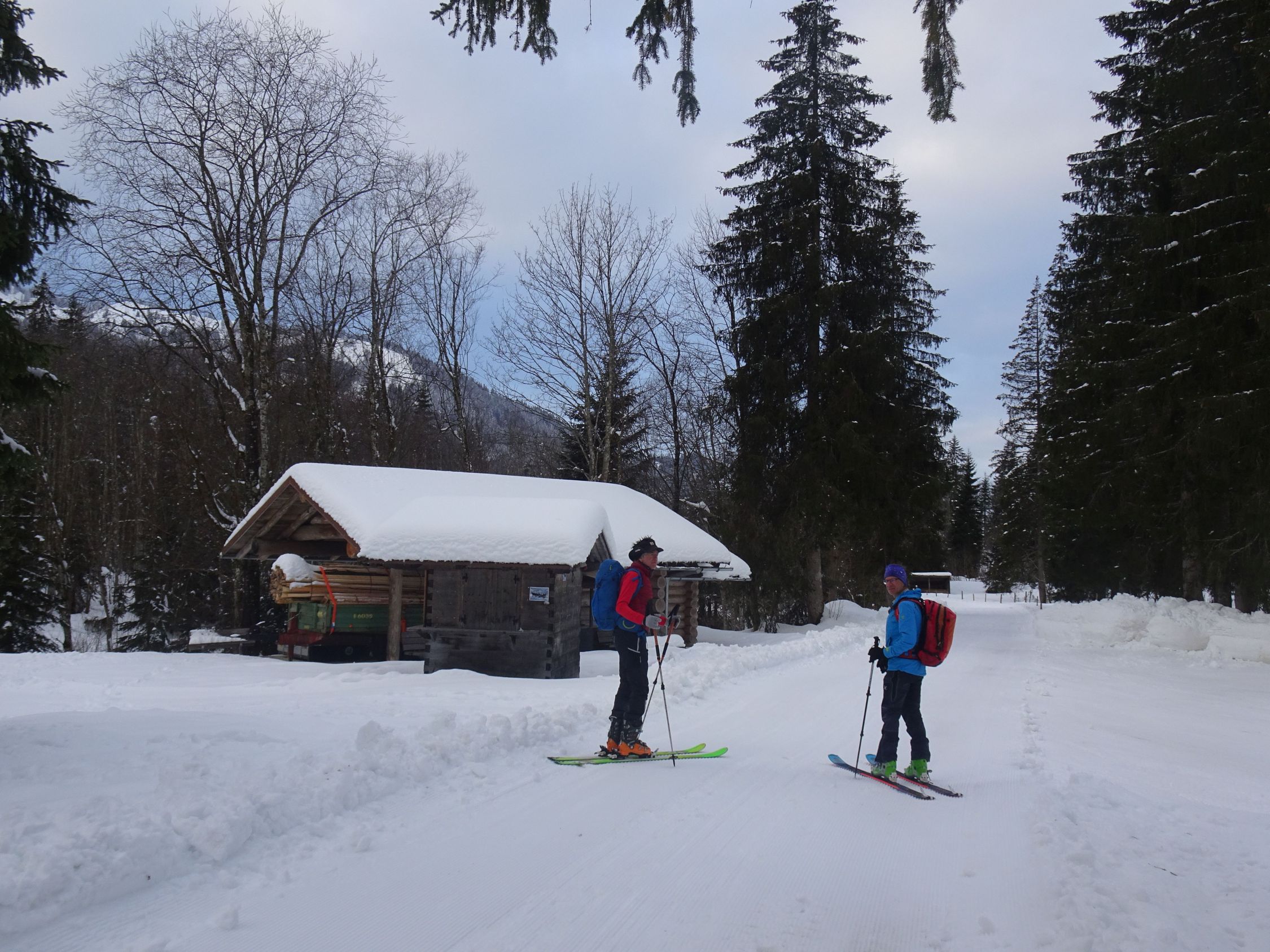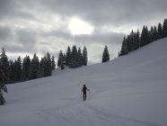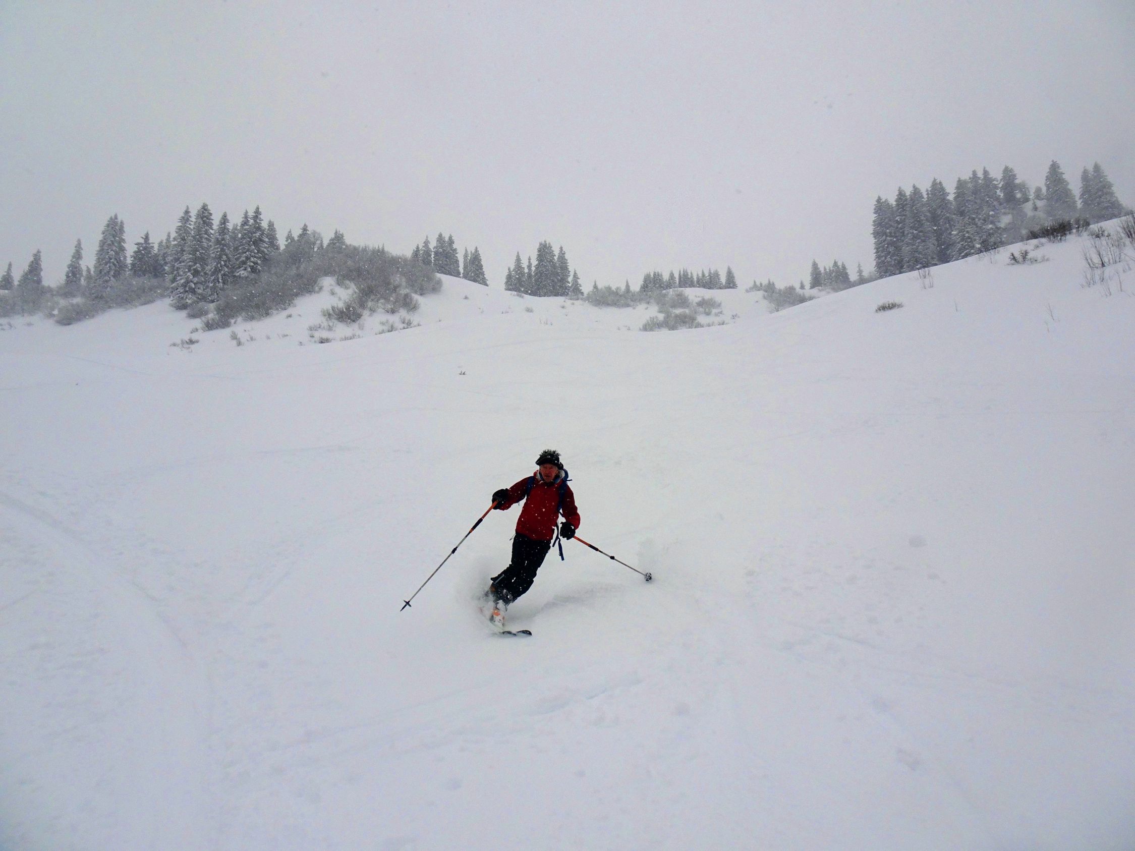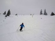 Sonne hat man heute kaum gesehen, meist mehr oder weniger wolkig mit ein paar Aufhellungen, ab Mittag dann Schneefall und Sichtverschlechterung. Einige Leute im Gebiet unterwegs, Burglhütte geöffnet. Wir waren nicht wie in der Beschreibung am Hochschelpen, sondern zweimal auf dem Burstkopf mit verschiedenen Abfahrten.