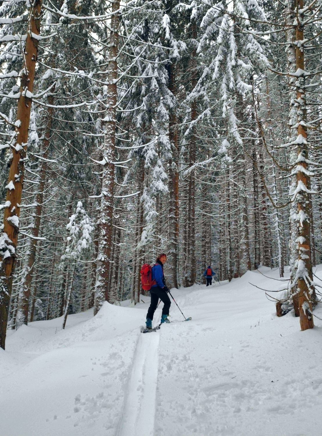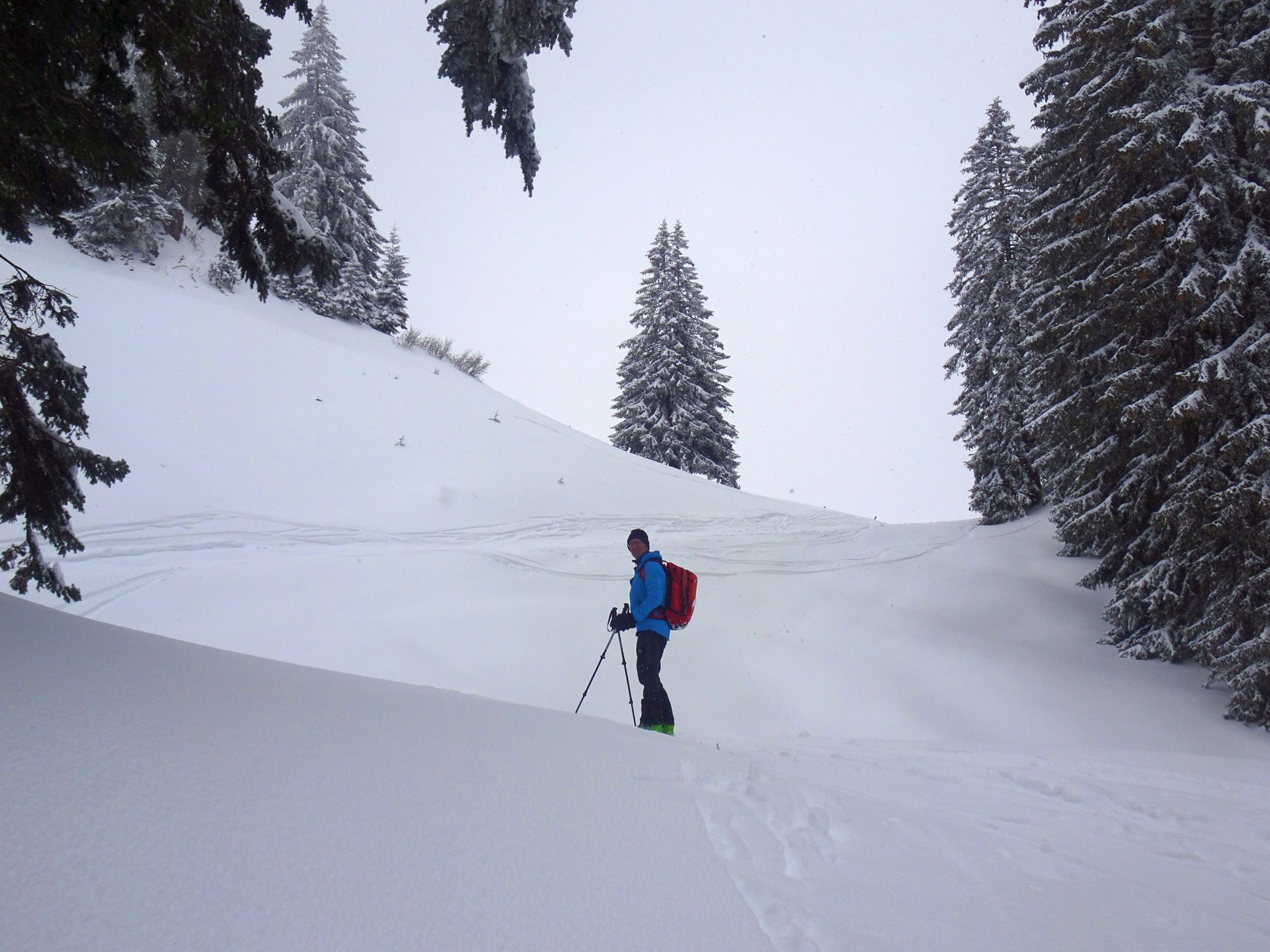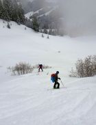 Gute Schneelage ab Start, auch die Waldpassage ist bestens eingeschneit. Der tags zuvor durchfeuchtete Schnee war bis etwa 1.300 m angefroren, ab da zunehmend locker und pulvrig. Alle Gipfelabfahrten schöne Pulverhänge und noch wenig verspurt. Unterhalb der Burstalpe dann auf dem Alpweg in´s Tal.