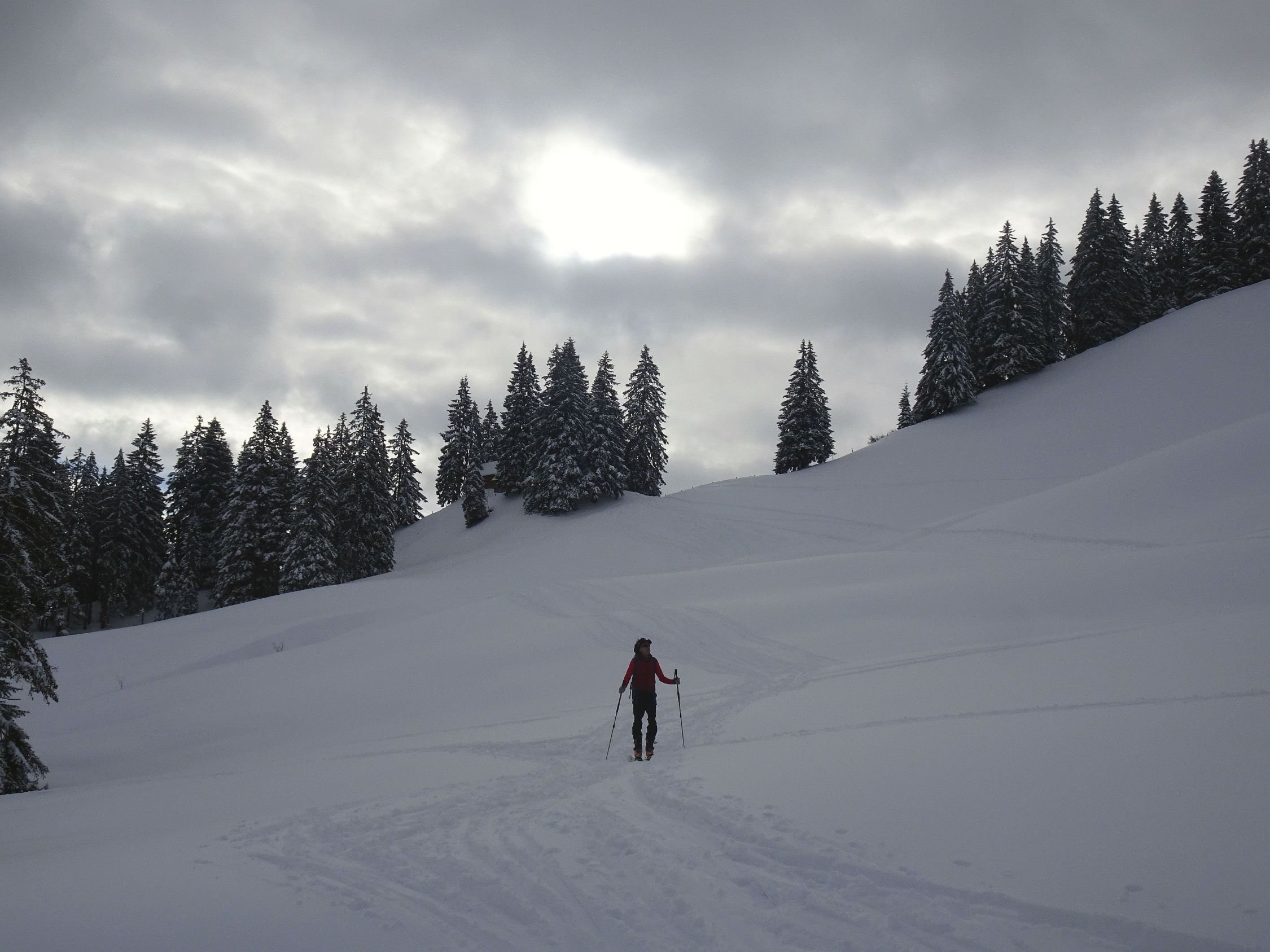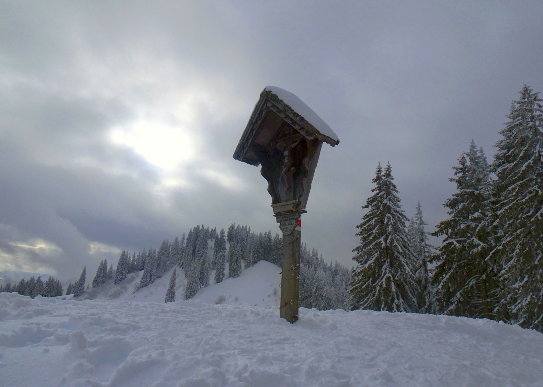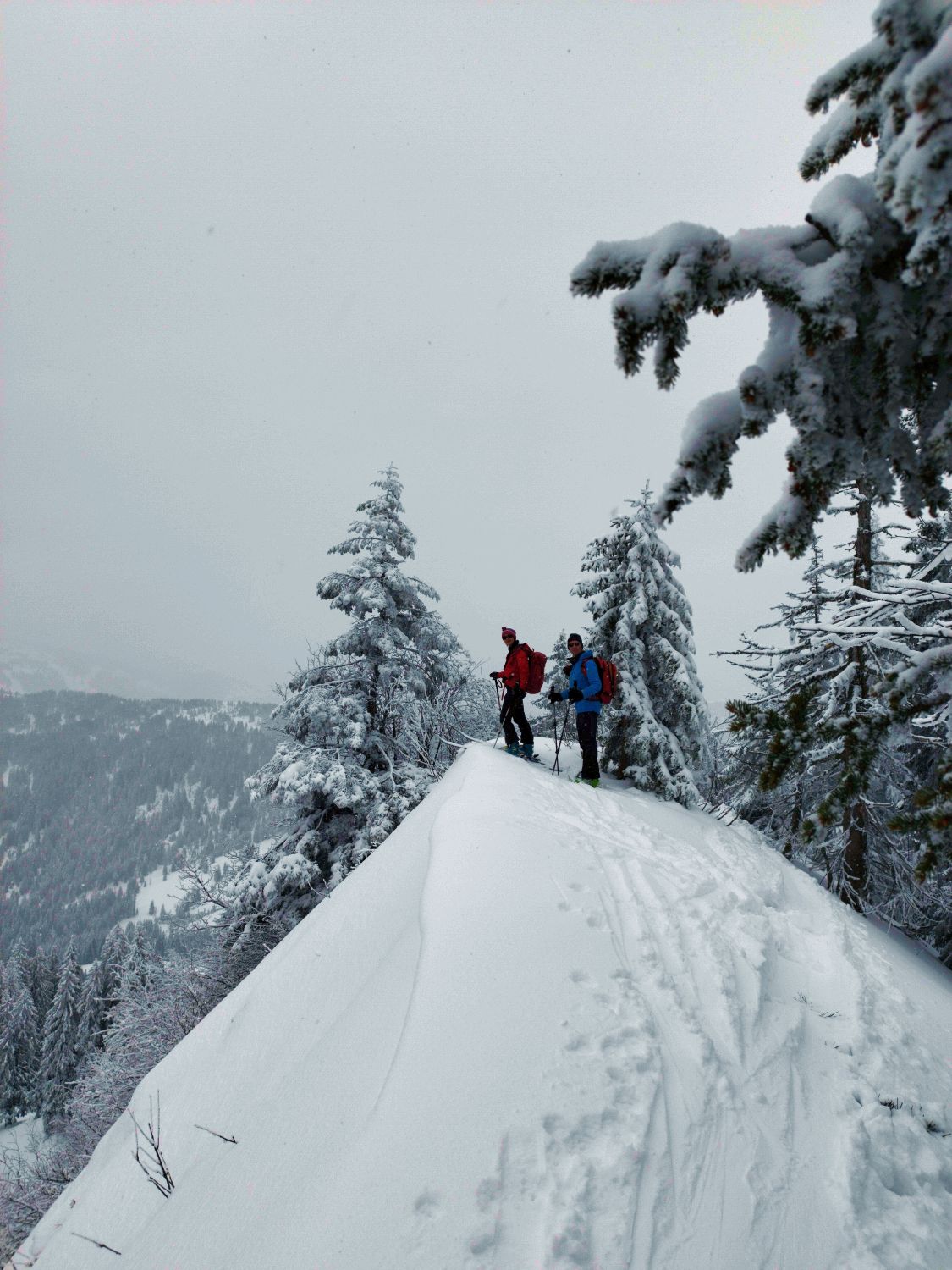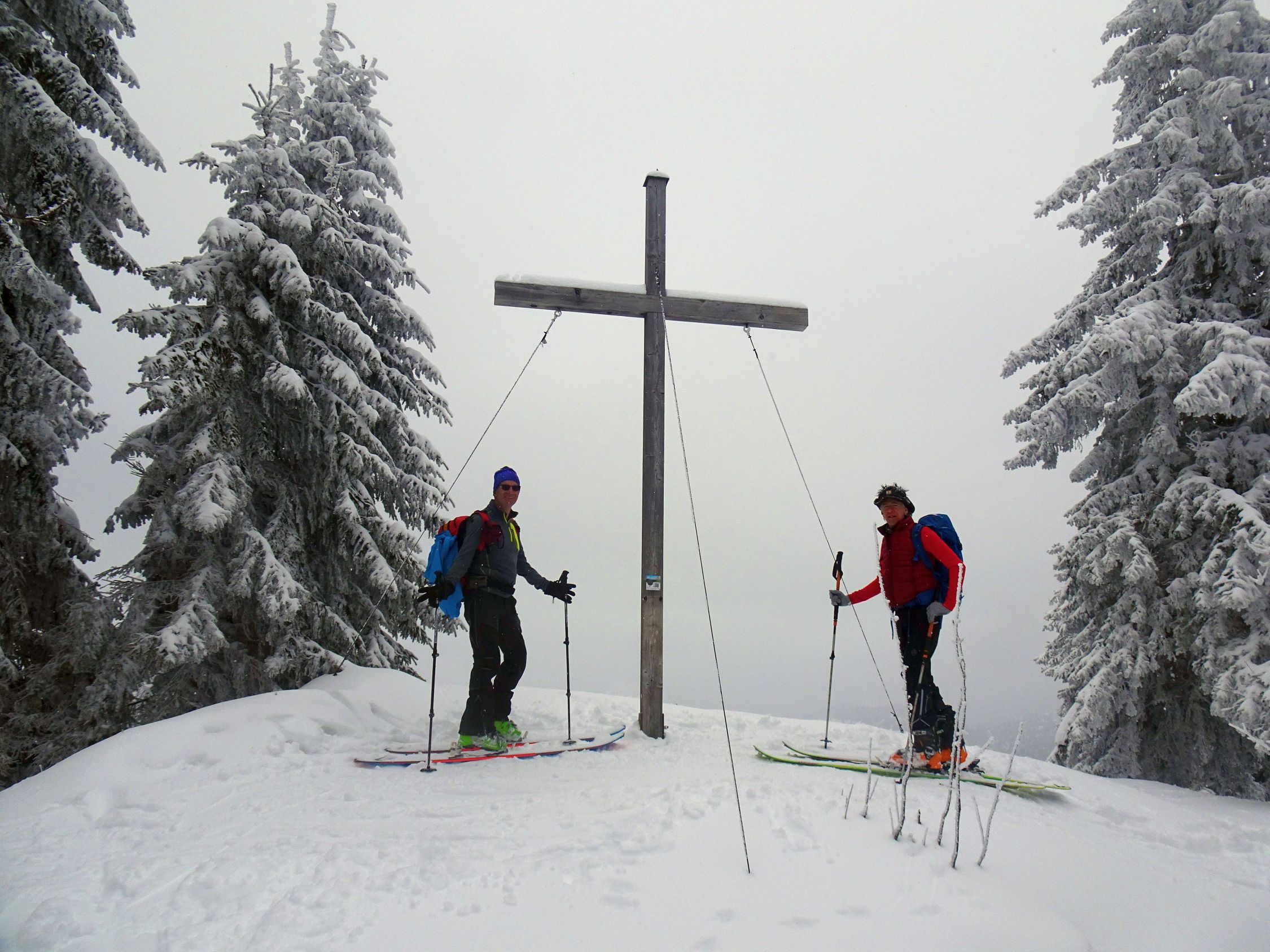 Beim Feuerstätterkopf waren wir erst wegen der Lawinenlage skeptisch, hat sich dann aber eher unkritisch dargestellt. Die steilere Passage im oberen Hang kann zudem auch rechts im Bogen durch Erlensträucher umgangen werden. Aufstieg zum Grat mit Ski machbar, gute Spur bis zum Kreuz.