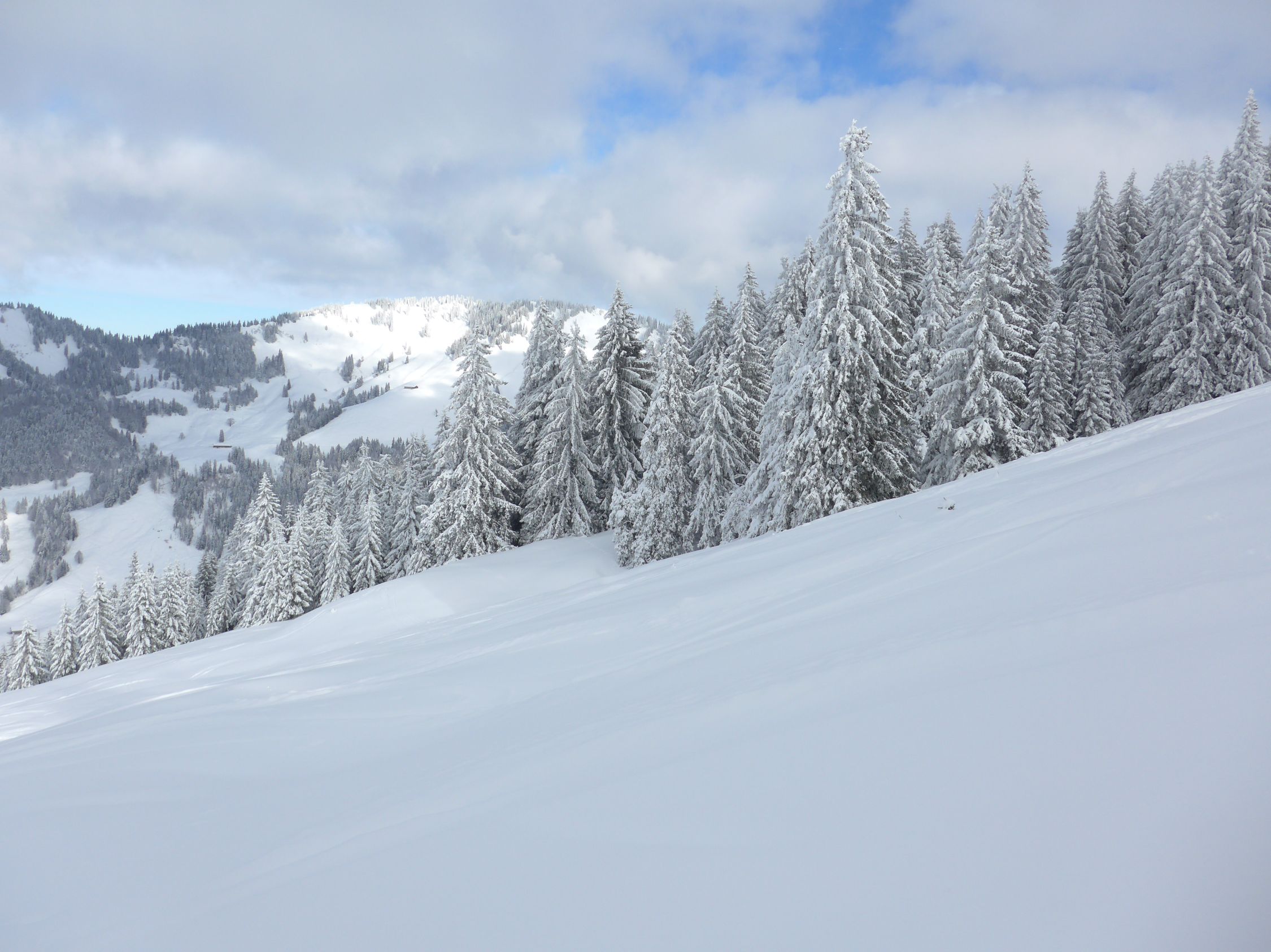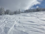 10 cm Neuschnee auf tragender Unterlage. Genug Schnee: keine Steine oder Wurzeln schauen durch. Nur einige alte Spuren im Altschnee stören den Wedelgenuss.