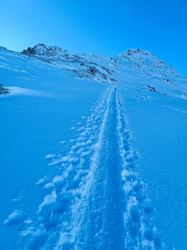 Der Wind hat den Neuschnee in die Mulden verfrachtet.Im Aufstieg sind Harscheisen über Geländerücken hilfreich.Die Mulden sind mit ca. 30 cm. Neuschnee schön zu fahren.Vier Personen sind zum Nätschen abgefahren,ansonsten noch wenige Spuren am Berg.Immer noch unterdurchschnittliche Schneehöhen im Gebiet.