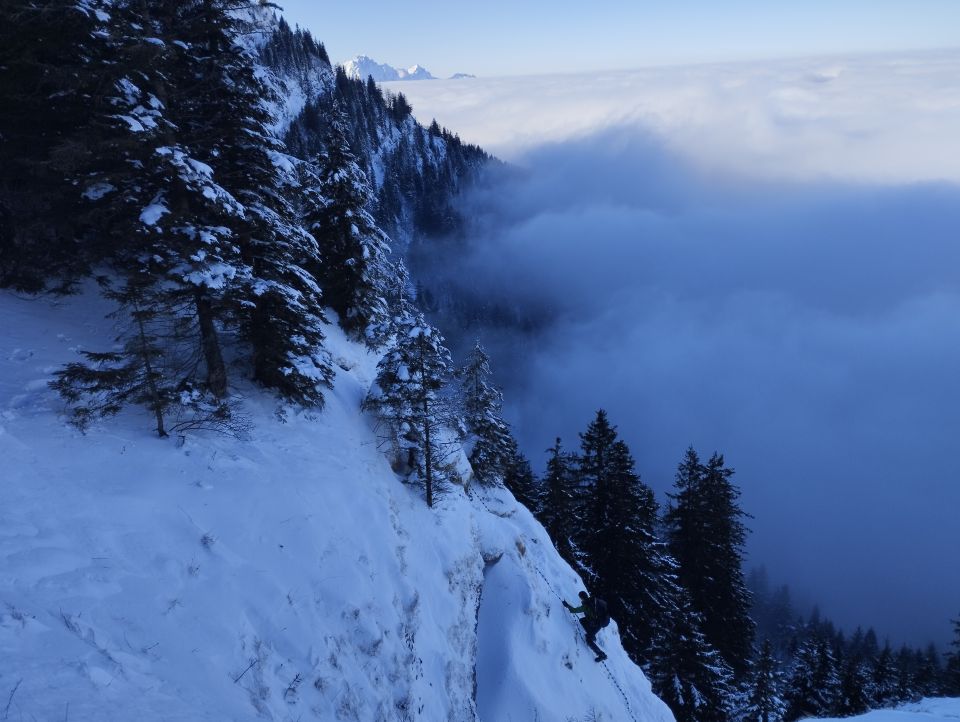 Wetter hat gepasst, Unten Nebel, oben Sonnenschein. sind um ca. 8:30 ab Seebodenalp gestartet. Gut gespurt, Wegfindung so kein Problem. Ohne Ortskunde und Spuren wäre dem nicht so. In den zwei Felsstufen, die direkt zur Ausstiegsplattform führen, waren noch keine Spuren vorhanden. Der Einstieg in die erste Stufe ist nicht ganz trivial, da das Seil, das über den brüchigen Nagelfluh-Fels führt, erst ca. 2 m oberhalb vom Stand hängt. Ein Schild ermahnt zur Vorsicht! Seilsicherung wäre zwar möglich, die Bohrhaken sind aber lose.