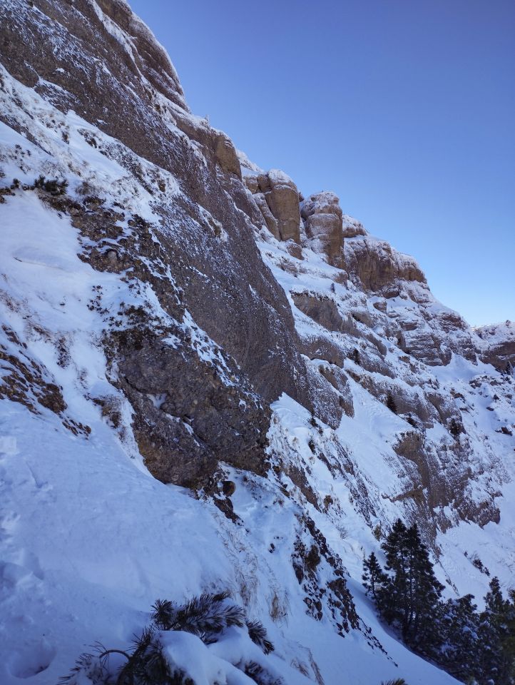 Also ein beherzter Kletterzug, danach mit dem Pickel ins Seil, festhalten und hoch ziehen. Dann folgt eine äusserst steile Firnpassage, bevor die zweite, finale Felsstufe auf die Plattform führt. Dort leider kein guter Trittschnee vorhanden (vom Wind verfrachtet) und die Kette musste ich erstmal ausgraben und das Eis abschlagen. Hier sind Pickel und Steigeisen empfehlenswert. Der Fels an sich wäre unangenehm zu klettern, da sehr brüchig. Danach direkt auf die Ausstiegsplattform, wo wir von einigen Zuschauern empfangen wurden, die von den Tiefblicken sichtlich beeindruckt waren. Kurze aber Eindrückliche Tour! Der Direktausstieg am Schluss verleiht der Route die Würze. :)