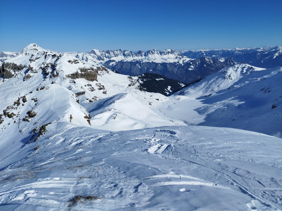 Start 7.30h bei -5Grad am kostenfreien Parkplatz Vermol zum Hühnerkopf und weiter immer dem Grat entlang über Madchopf, Lagrain, Walachamm auf den Guli alles mit Ski in allen Schneearten machbar. Abfahrt direkt vom Gipfel in den steilen Osthang und der Rinne bei Rotwand nach Chläui in feinstem Pulverschnee.