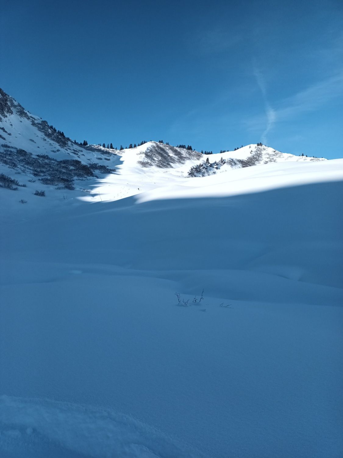 Gute Schnee-Verhältnisse im Gebiet. Südseitig zunehmend Deckelbildung, nord- u. schattseitig Pulver