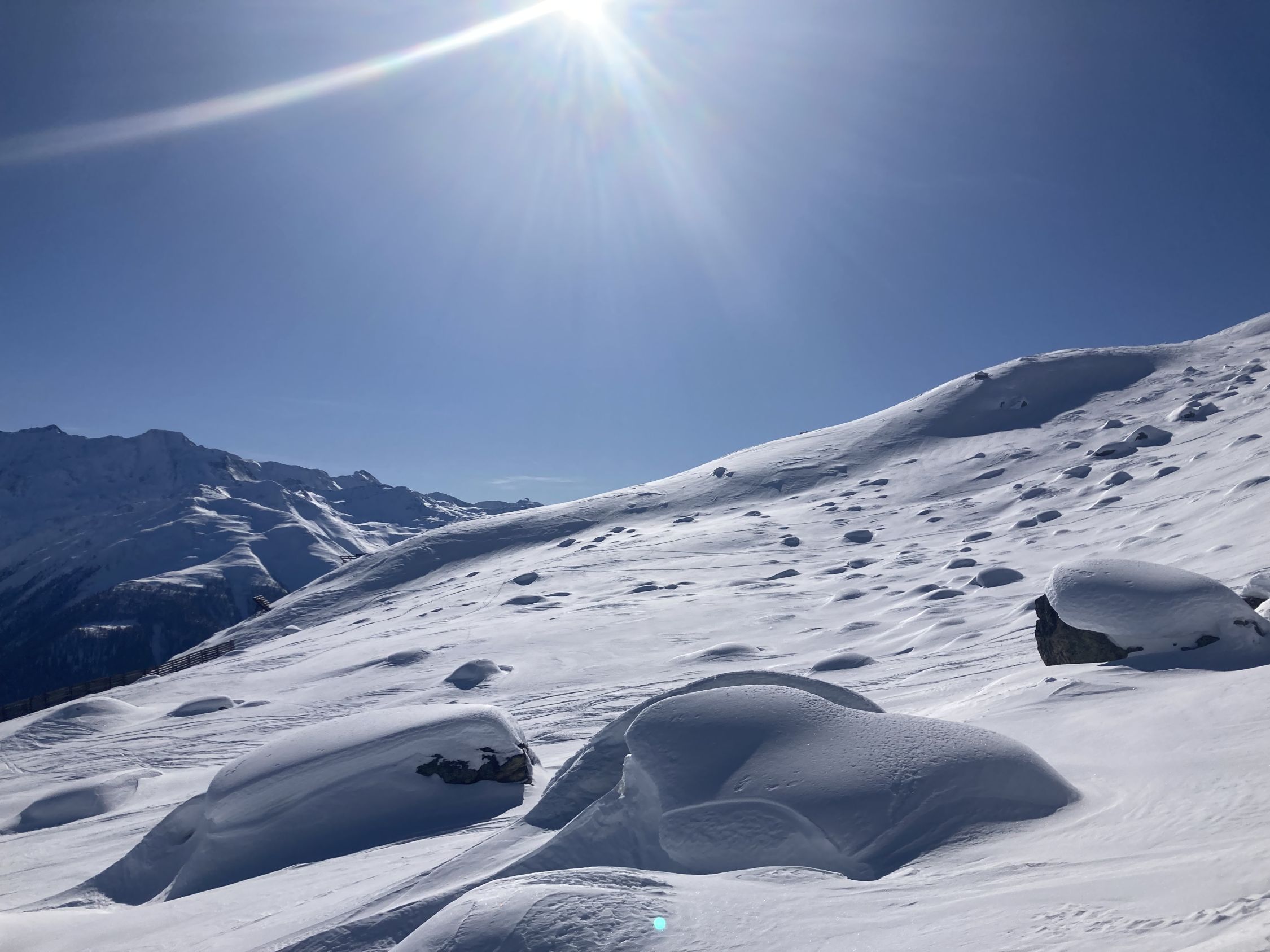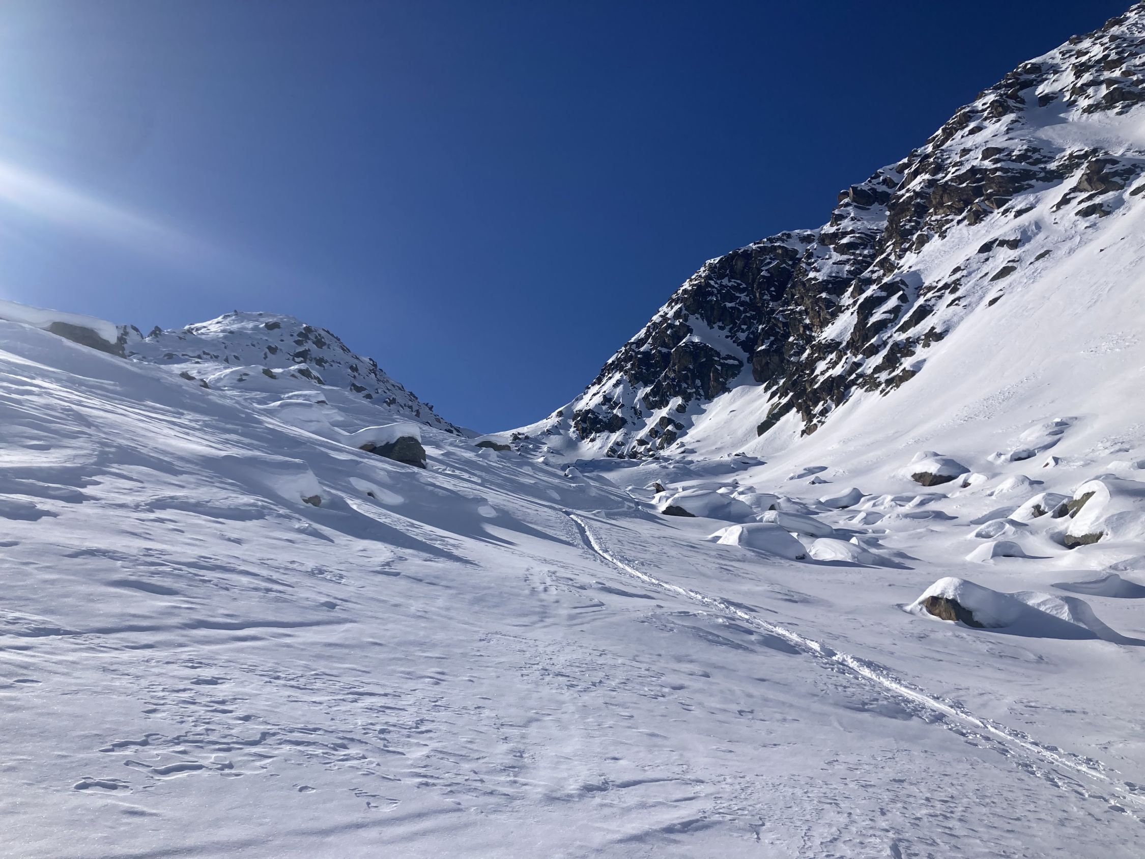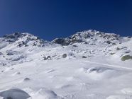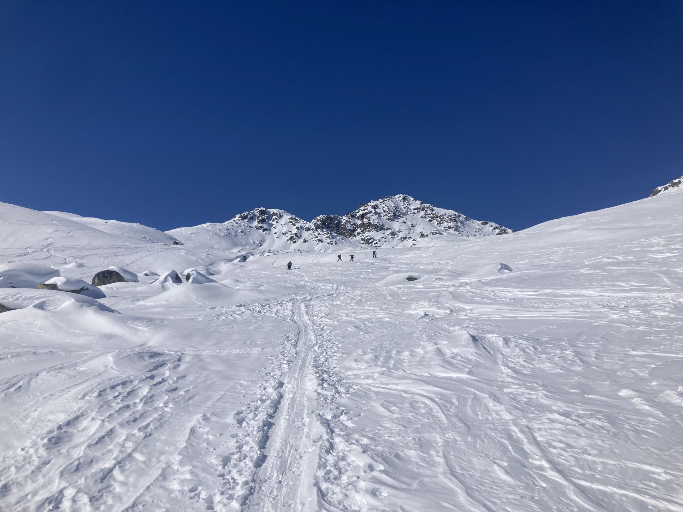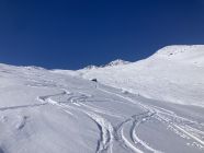 Da momentan noch ziemlich kalt, ist die Schneequalität immer noch sehr gut, es liegt weitgehend sogar noch Pulverschnee. Da auf der ganzen Strecke die Hanglage nicht zu steil ist, auch ziemlich Lawinensicher.