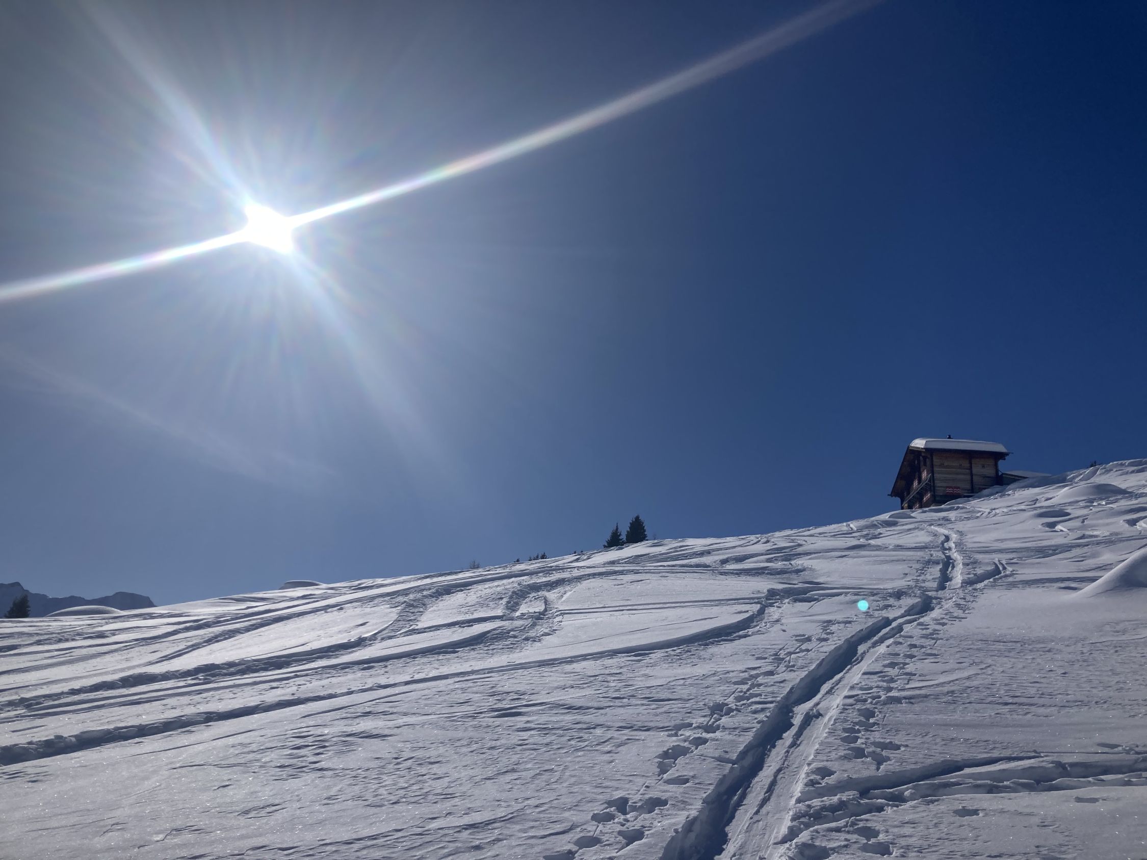 Der erste Waldteil ist auf der Direktroute via Wald zu empfehlen. (siehe GPS Track) ansonsten viel längere Strecke via Normalweg. Nach dem ersten Waldstück je nach Verhältnisse direkt den Wald hoch oder eben der Bergstrasse nach, was weniger Kraftzehrend ist und wo es schneller vorangeht. Bei der Galmihütte wie immer bei diesem Wetter eine top Aussicht und immer ein Besuch und eine kurze Pause wert.