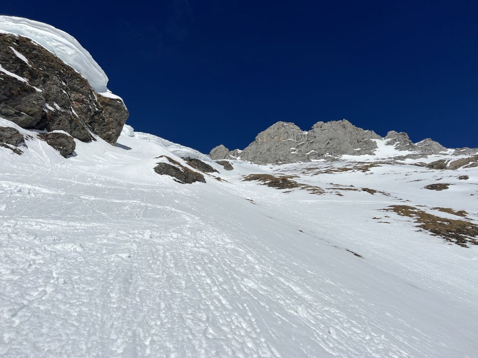 Noch weniger Schnee als erwartet. Alle Spuren aus den voraus gegangenen Tagen endeten rund 200m unterhalb der steilen Gipfelflanke, weshalb ich diese neu gespurt habe (steiler hätte ich nicht spuren wollen…). Ich wählte die Abfahrtsvariante über Gumm, welche jedoch sichere Verhältnisse braucht. Die Abfahrt entlang dem Aufstieg ist nicht lohnenswert, da viel zu wenig Schnee und sehr viele Steine.