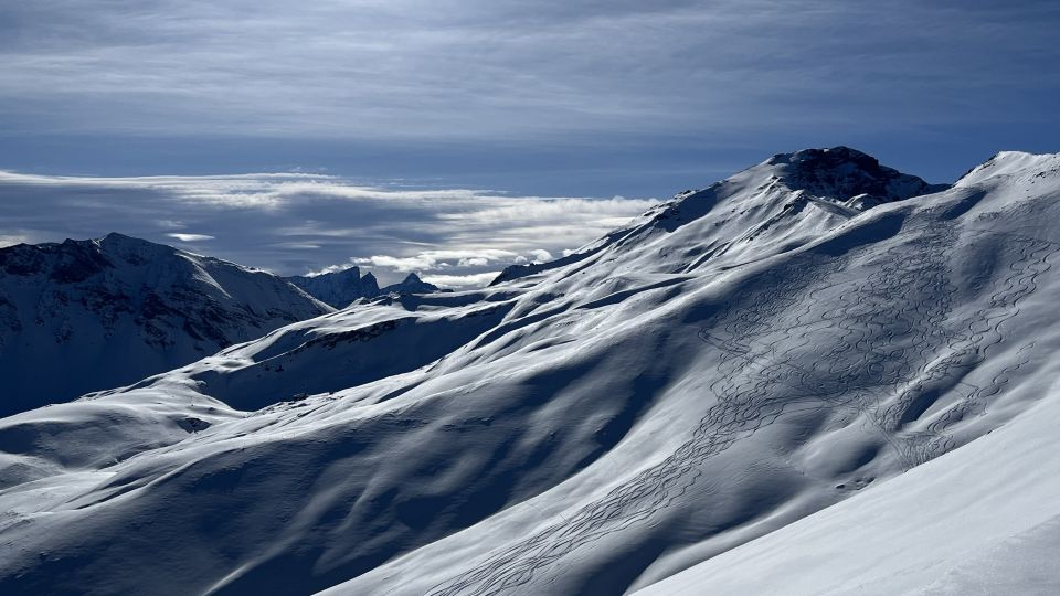 Für die Abfahrt im z.T. bodenlosen Griespulver sind breite Skis vorteilhaft. Pulver gibt es überall noch, obwohl sicher über 100 Spuren vorhanden sind.