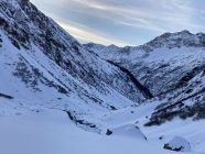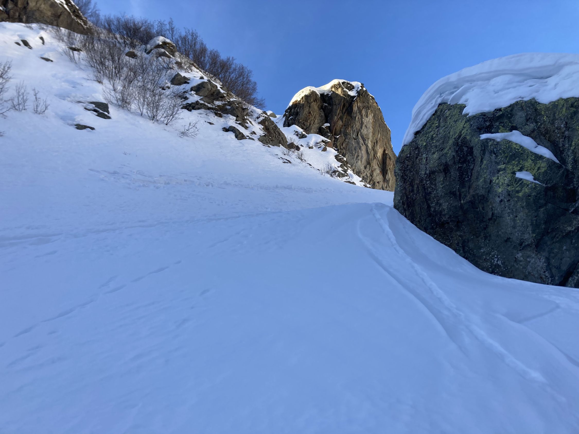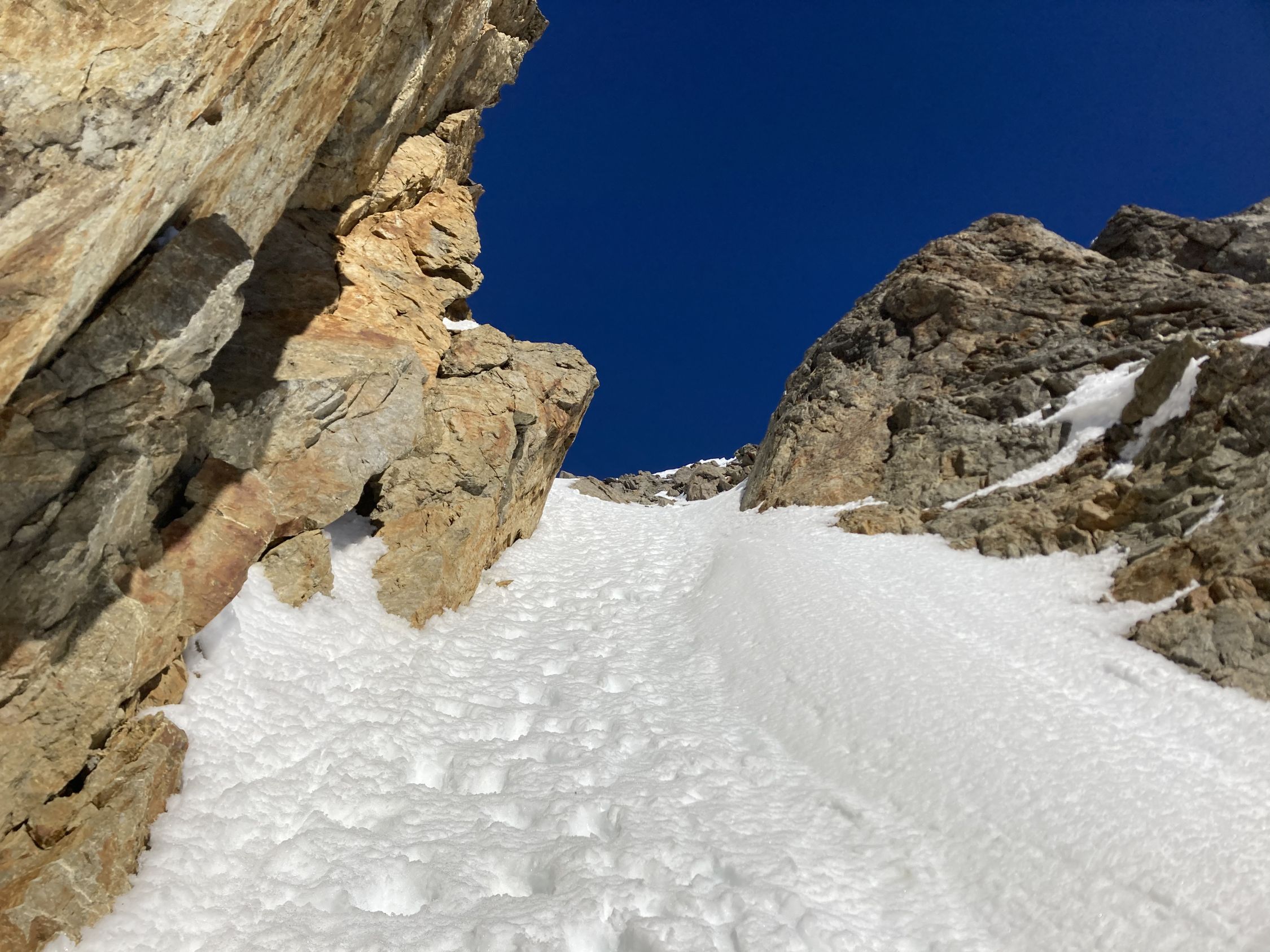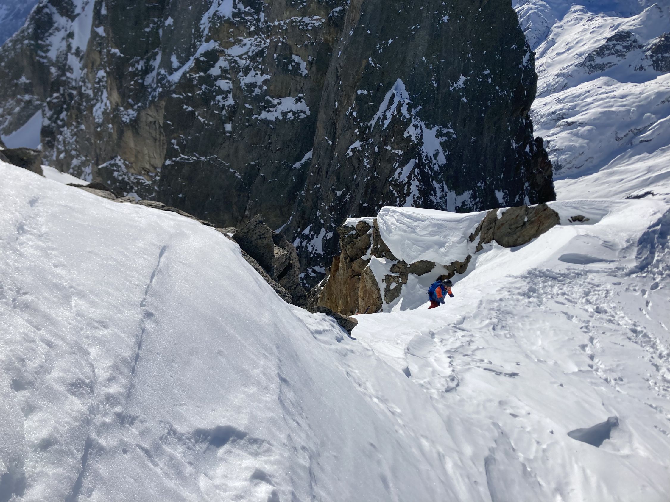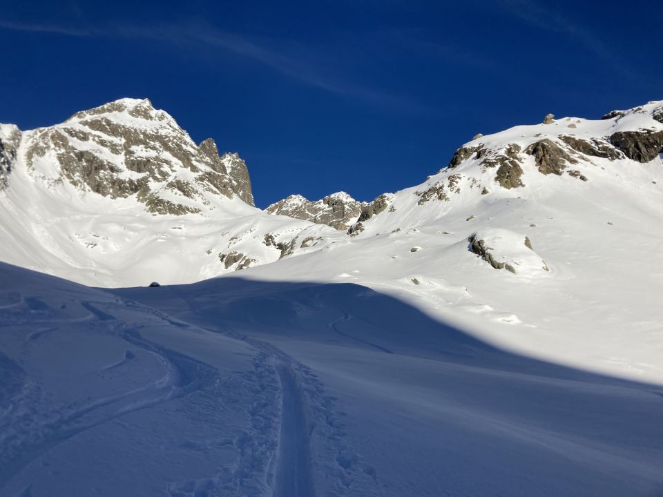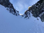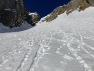 Normale Aufstiegsroute zum Stössensattel nicht gut, wohl griessiger Schnee auf Fels, eine Gruppe kehrte dort. Alternativ dann das Couloir rechts davon hoch, 250 hm, 40-45 Grad, guter Trittschnee.