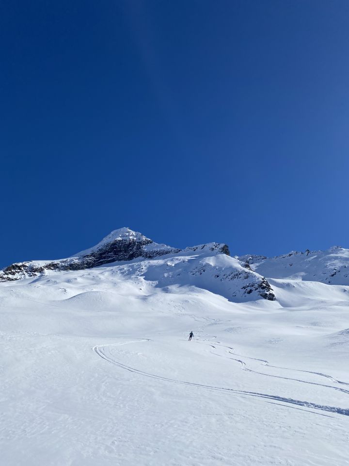 In der Abfahrt vom Skidepot zur Hütte gibt es viele schöne Pulvermulden mit viel Platz für neue Spuren, aber immer wieder mal Stellen mit Deckel.