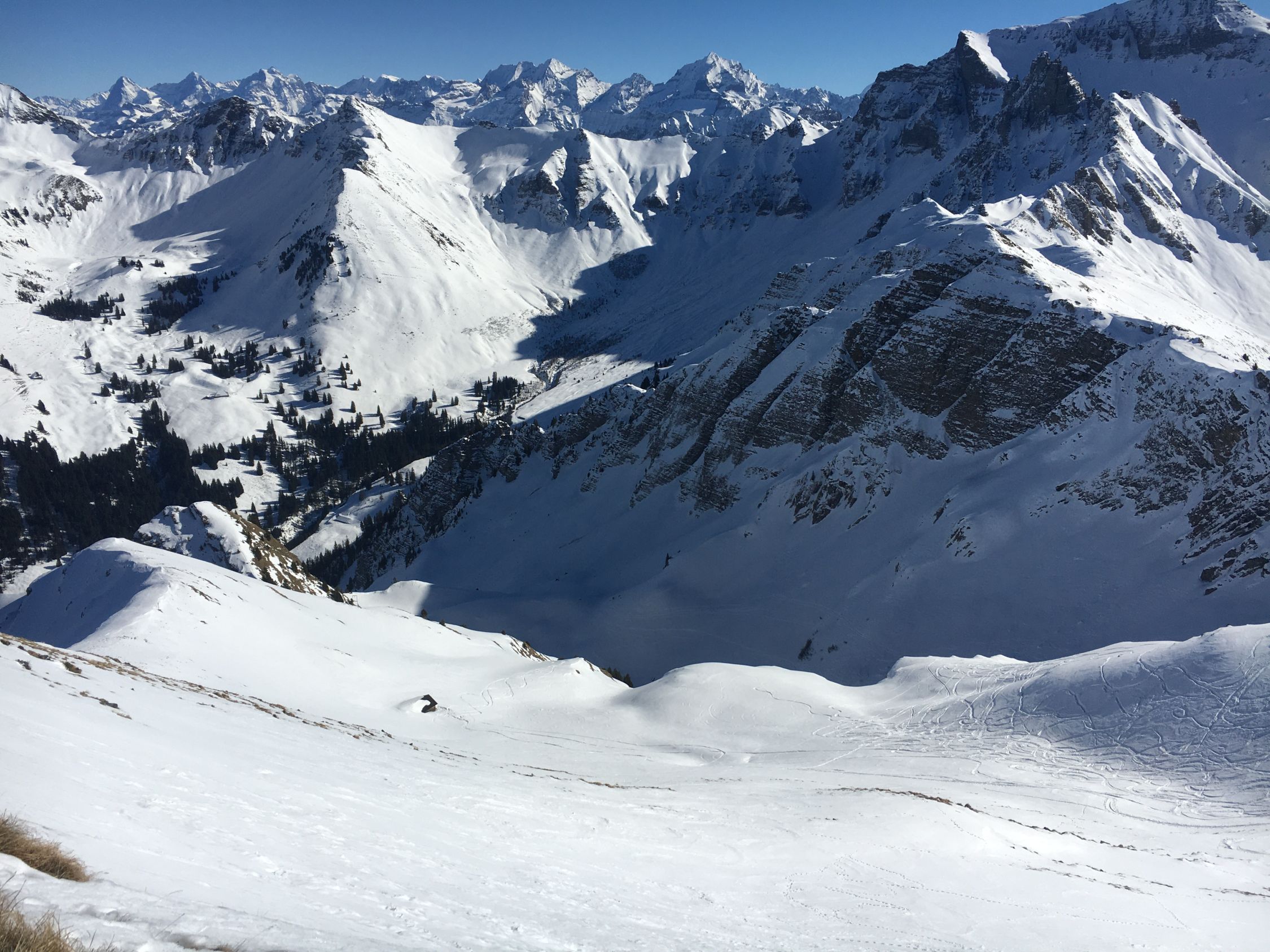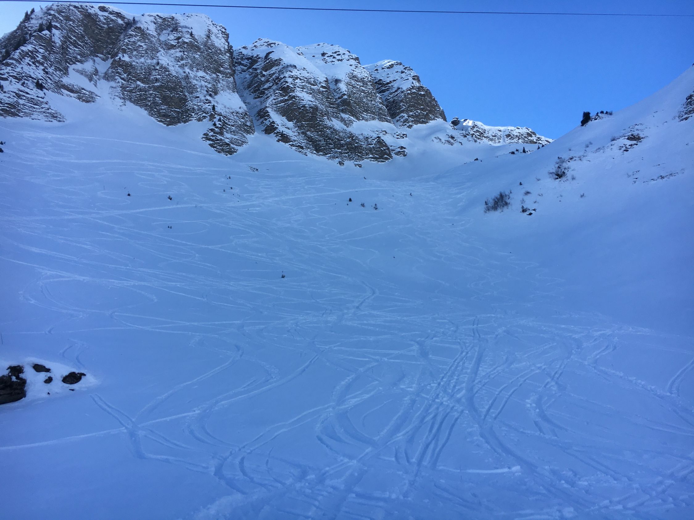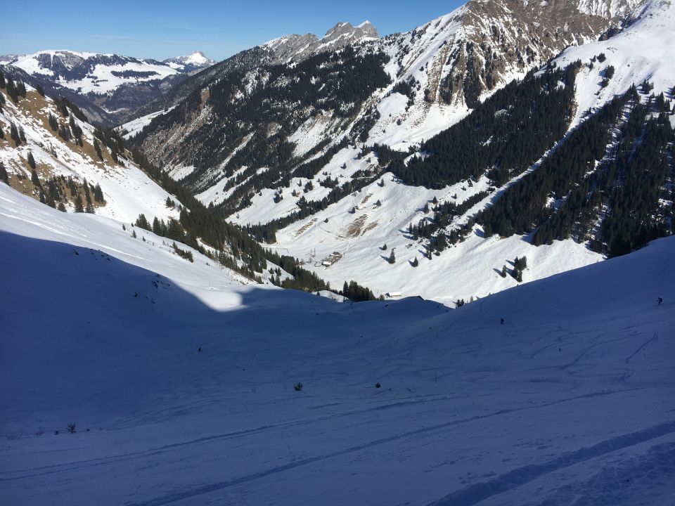 In der Abfahrt über die Ostflanke ins Fildrich waren noch erstaunlich gute Verhältnisse mit Pulver, wenn auch schwerer.