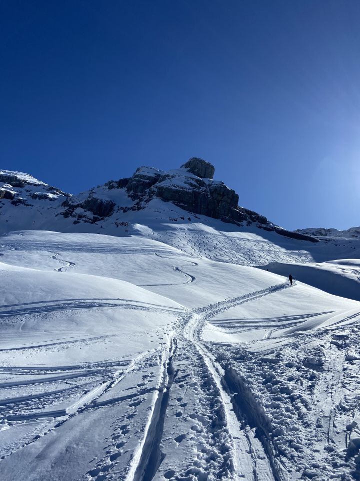 Der Schnee wird nasser und schwerer. Mit ganz viel Vorsicht kann man Steinkontakt vermeiden. Reinen Pulver findet man nur in der Couloir-Abfahrt vom Gipfel, ansonsten Hartschnee oder Sulz.