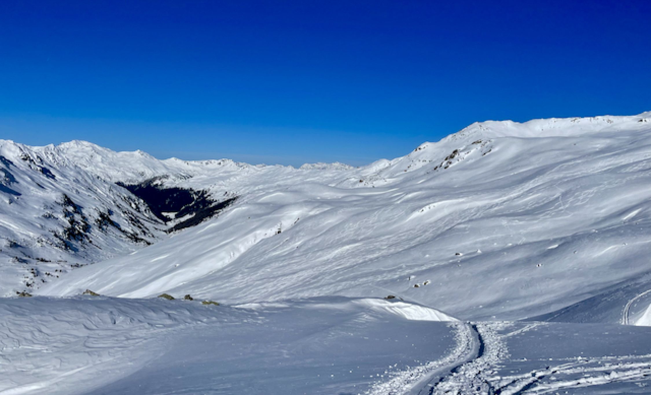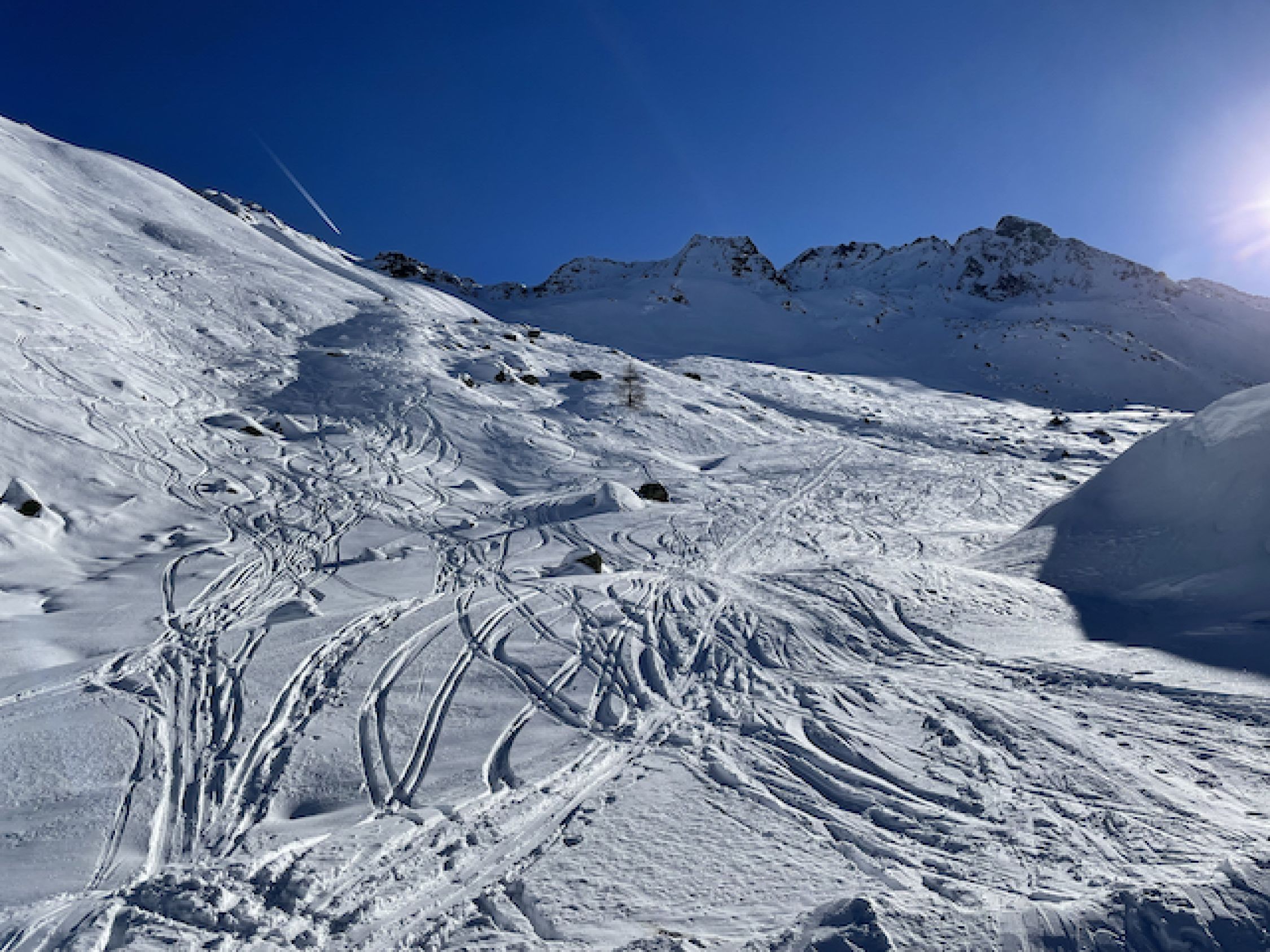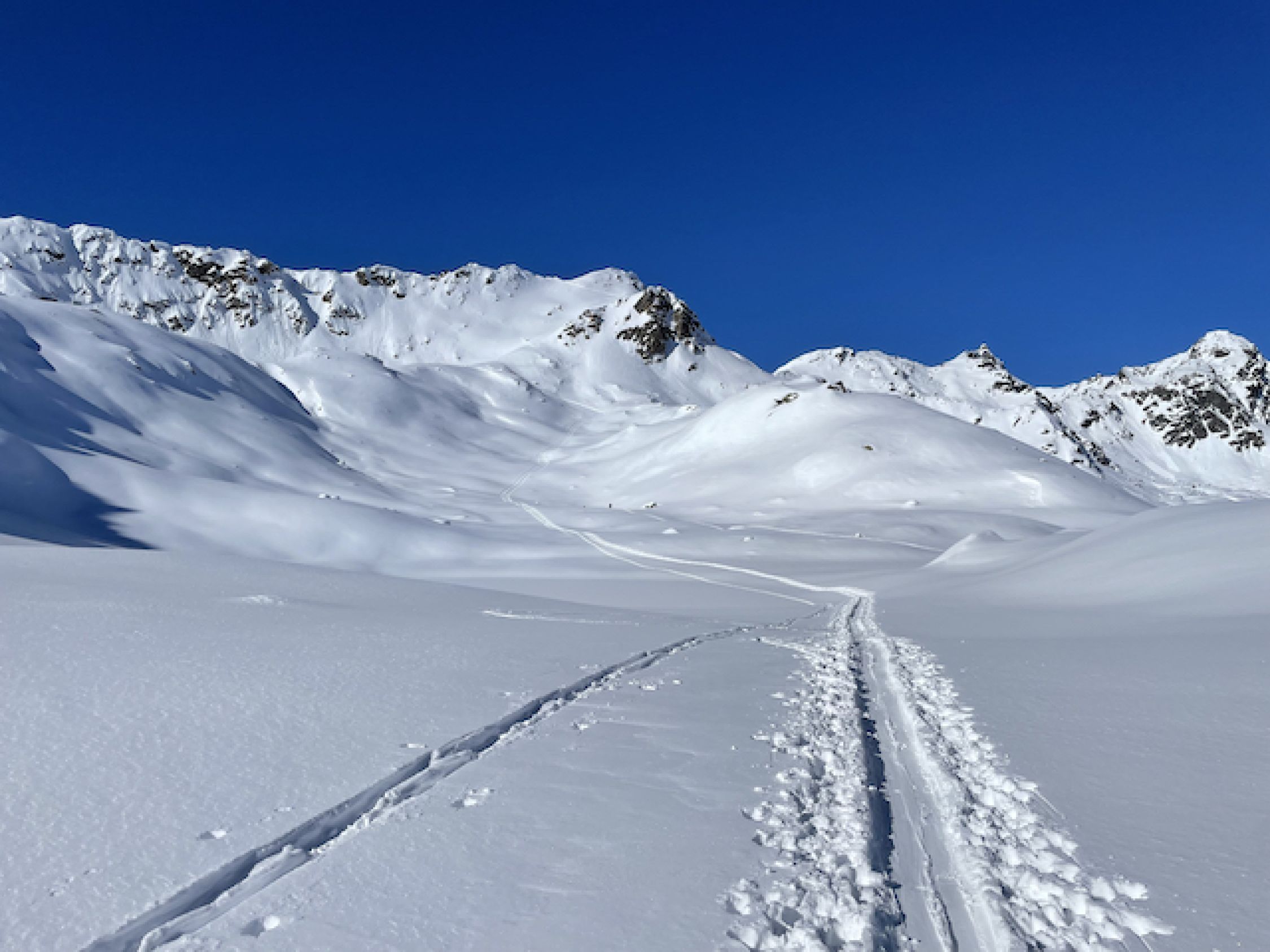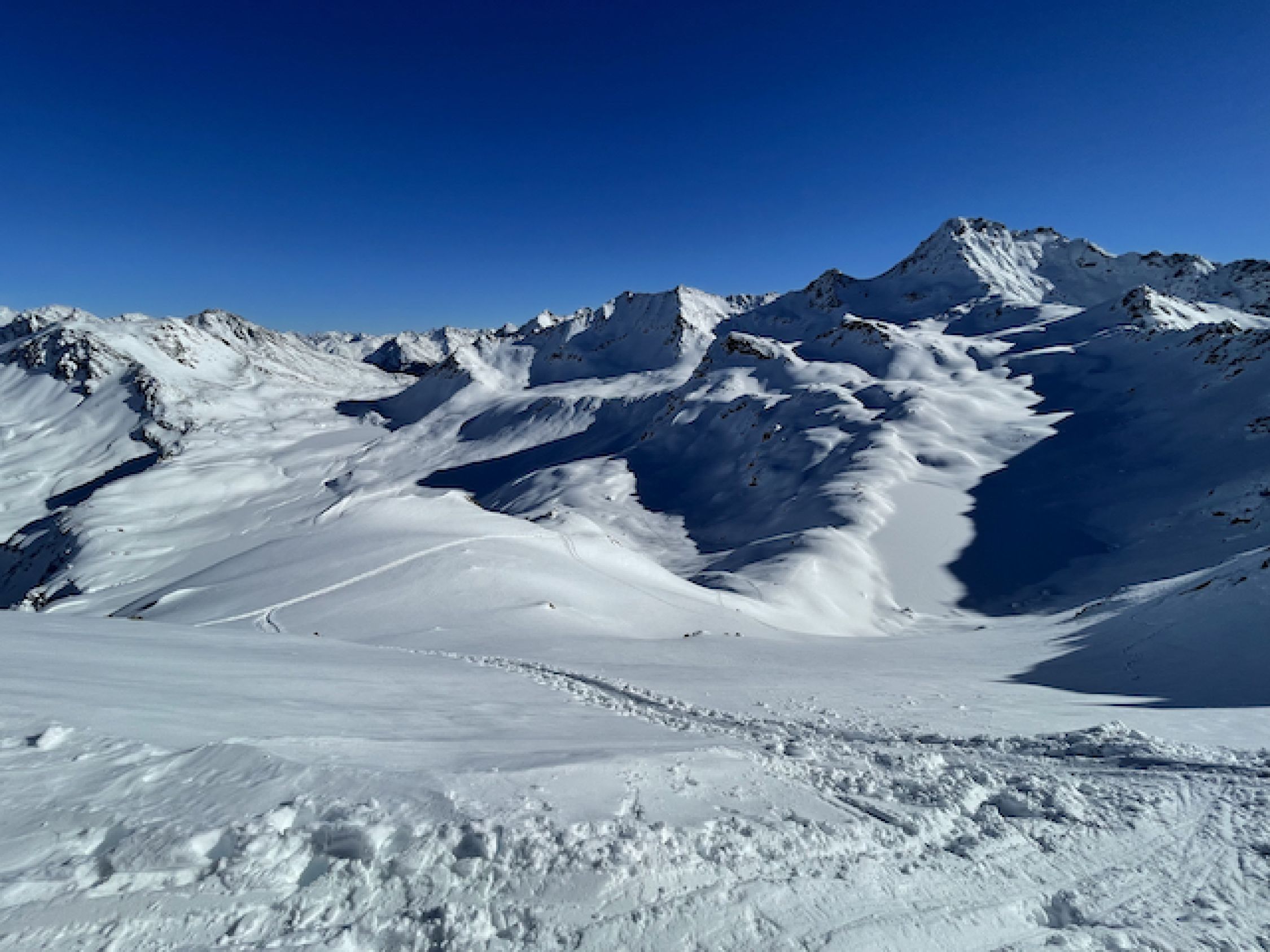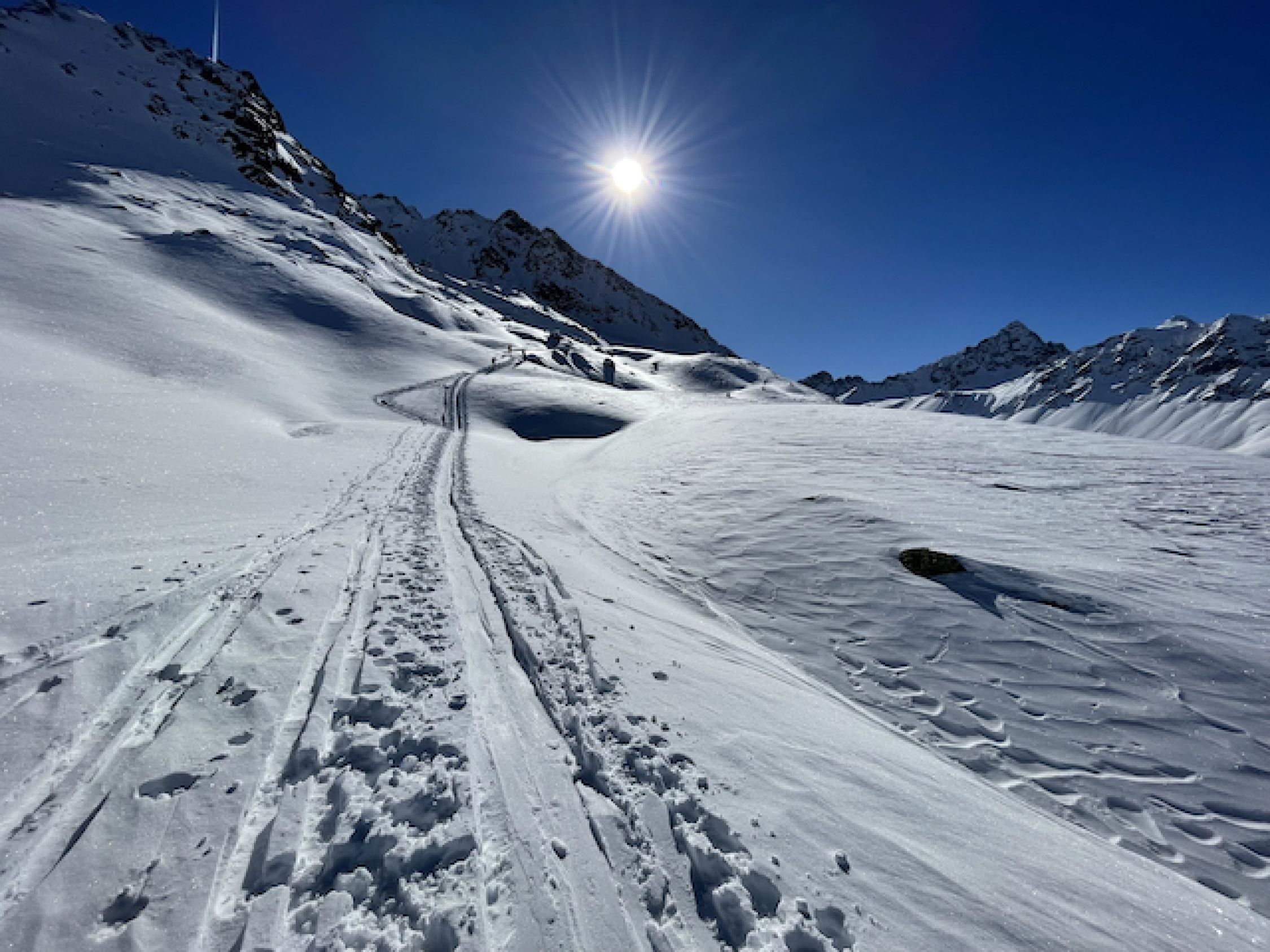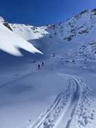Vom Parkplatz weg ausreichend Schnee, jedoch nicht üppig. Auf der Passstraße etwa 5 cm gewalzte/festgefahrene lückenlose Schneedecke, damit rauf wie runter pistenartig fahrbar. Im Aufstieg zur Winterlücke alles bestens. Runter zu den Jöriseen Pow of finest quality - besser geht's kaum. Wiederaufstieg zum Übergang bei 2771 ebenfalls alles gut. Abfahrt runter zur Passstraße irgendwas zwischen schwerem Pow und Sulz, was erstaunlich gut zu fahren war. Man muss jedoch die Sharks im Blick haben. So ganz ohne Feindkontakt schaffte es keiner von uns. Deshalb ein Smiley Abzug. Insgesamt jedoch sehr schöne und immer wieder lohnende Tour.