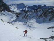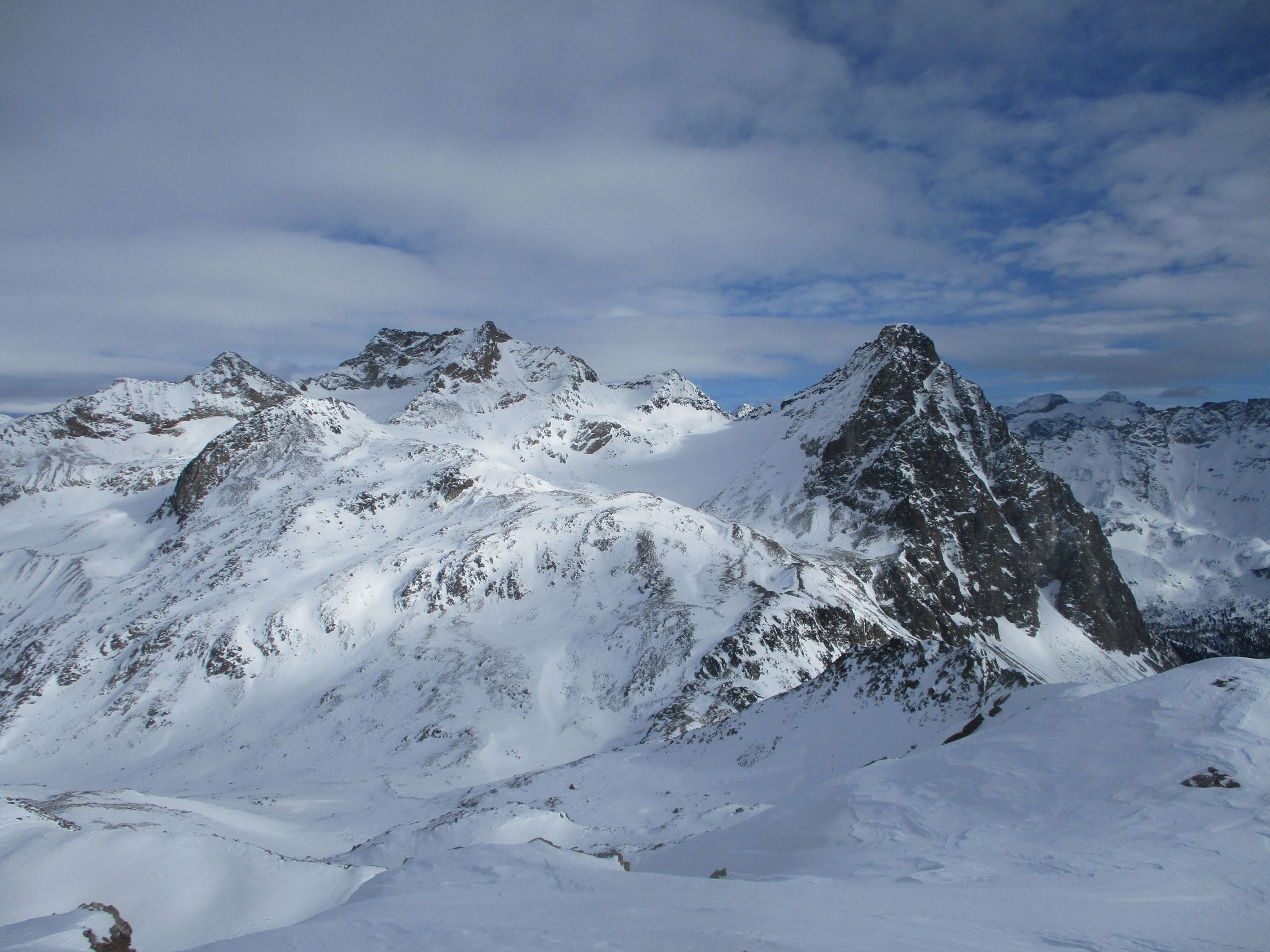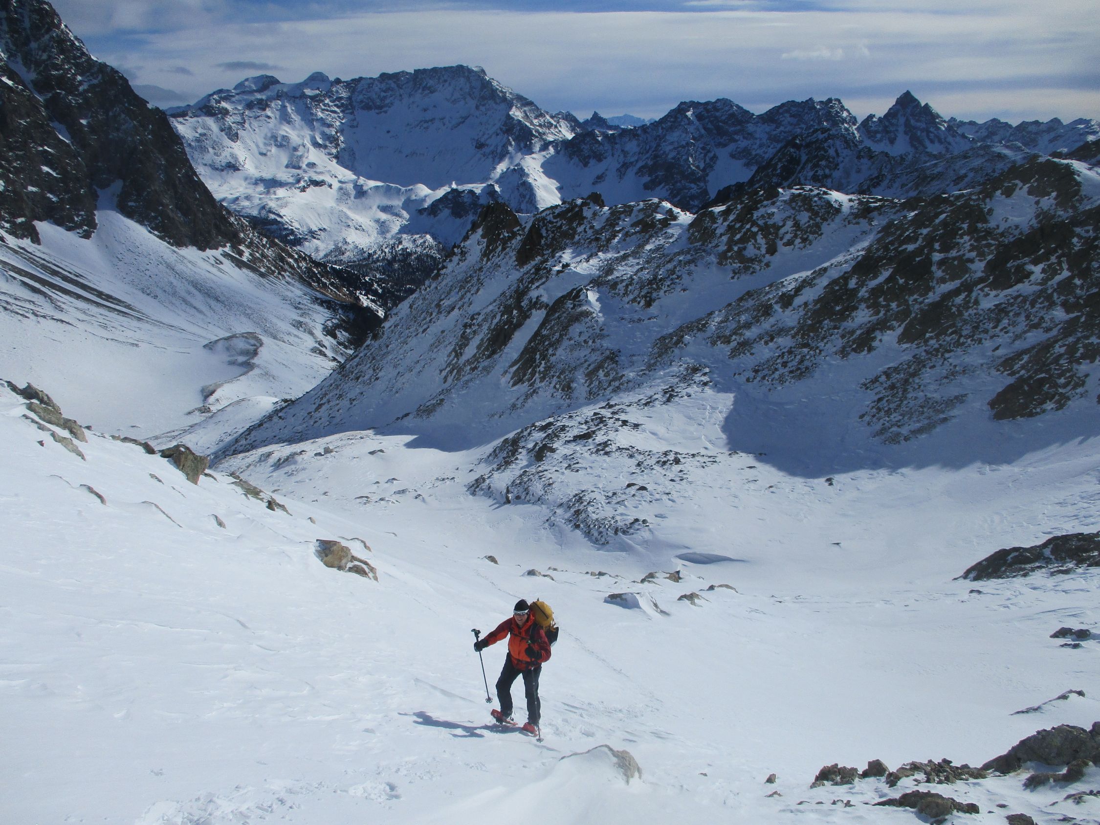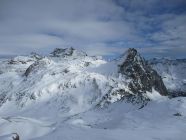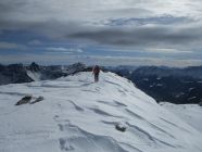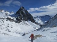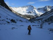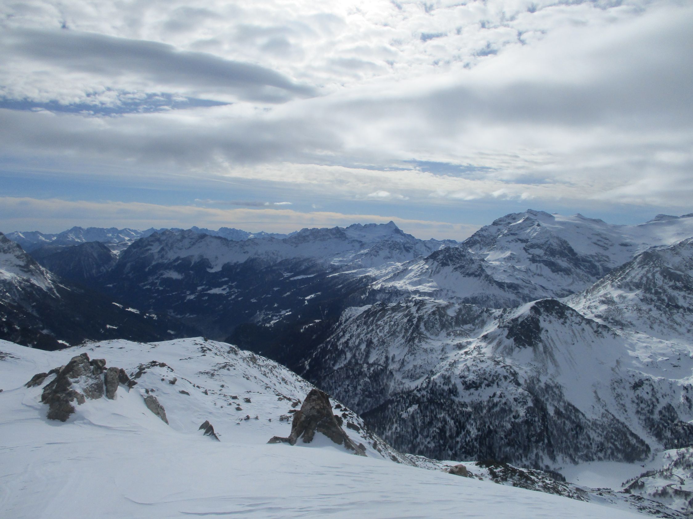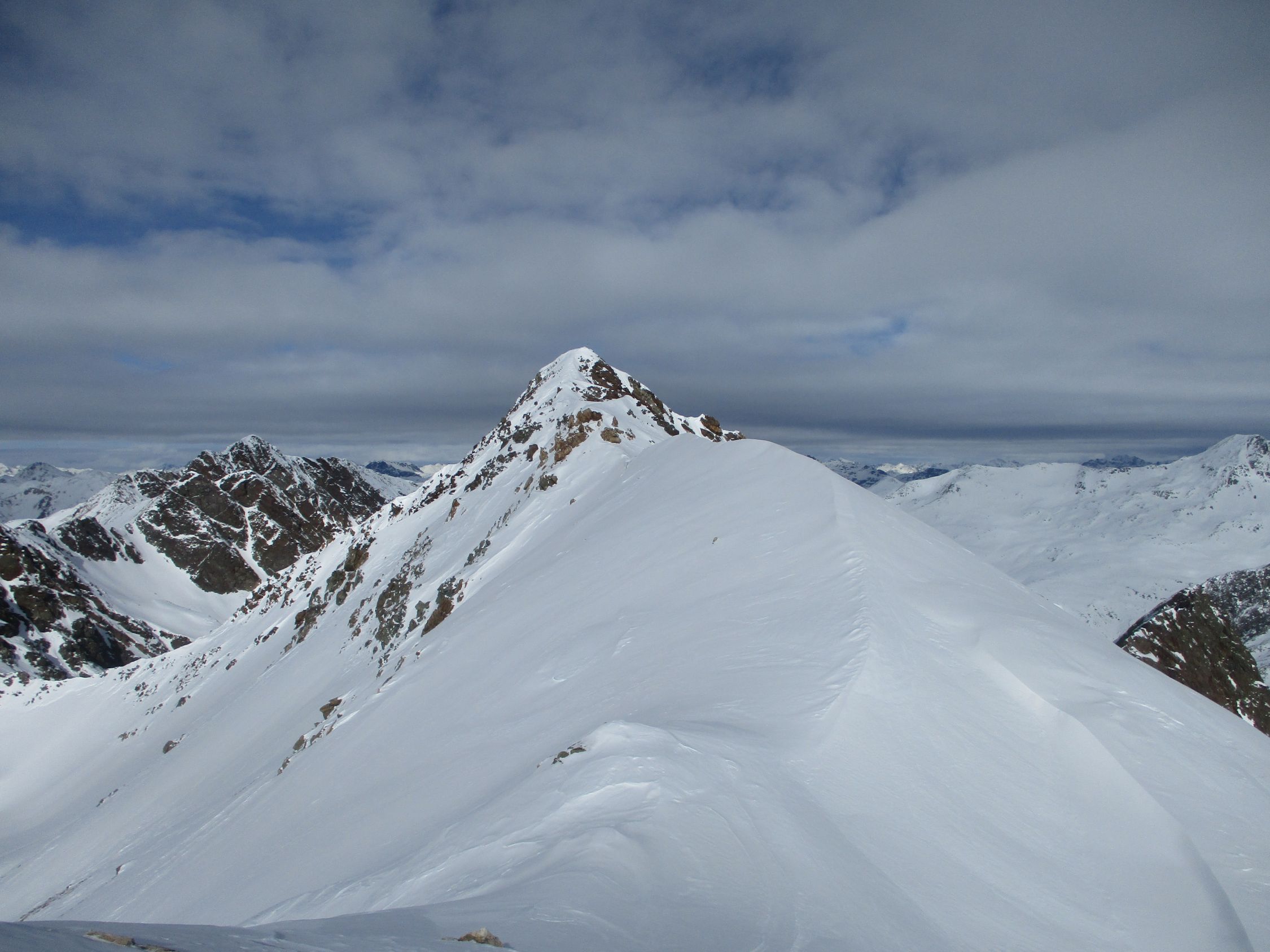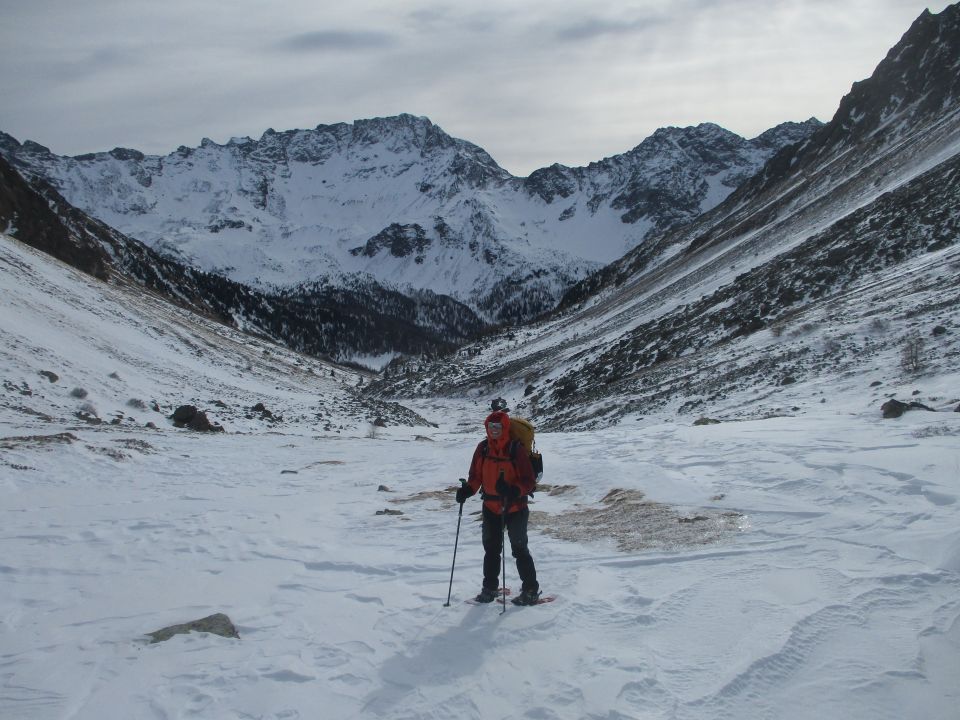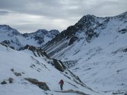 Das Val Mera zeigte sich recht schneearm, was mit Schneeschuhen aber nicht weiter störend war. Alte Spuren waren meist verwittert, insofern war Neuspuren nötig. Auch wenn die Schneedecke überwiegend trug, brachen wir doch immer wieder ein, was unser Aufstiegstempo eingermaßen drosselte, sodaß wir erst nach mehr als 5 Stunden Aufstiegszeit am Schneeschuhdepot vor dem Grat ankamen. Dieser war ohne Spur, und ein kurzes Stück "Biancograt" erschien uns doch sehr ausgesetzt, Zudem rannte die Zeit davon, weshalb wir mit gemischten Gefühlen angesichts des Hauptgipfels salutierten und es bei P. 3015 beließen.