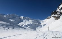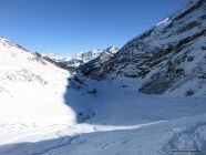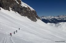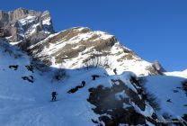Es hat verschiedene gute Spuren für den Aufstieg. Im Hang bei Lang Schnee sind zwei grössere Nassschneelawinen abgegangen (vermutlich vor 1 - 2 Tagen), welche durchquert werden müssen. Ausser man fährt in den Kessel ab und umgeht sie tief unten. Der Rücken vom Pass zum Gipfel ist ausnahmsweise nicht abgeblasen und gut mit Schnee bedeckt.