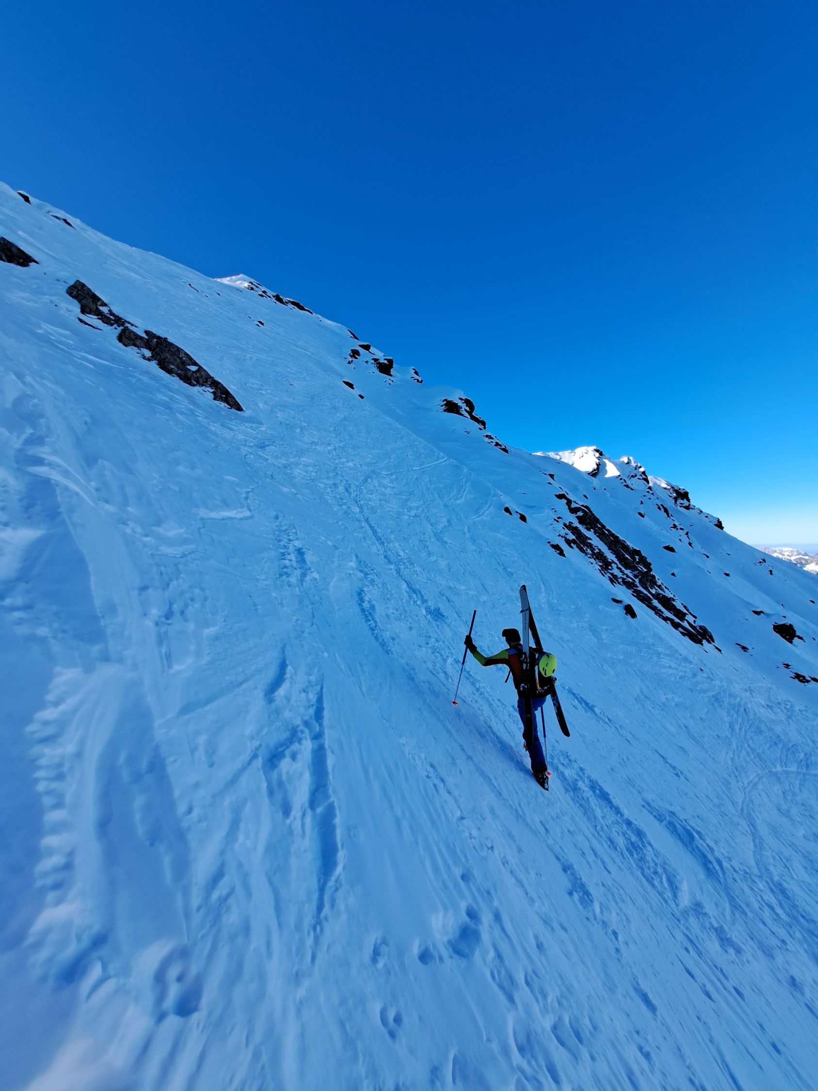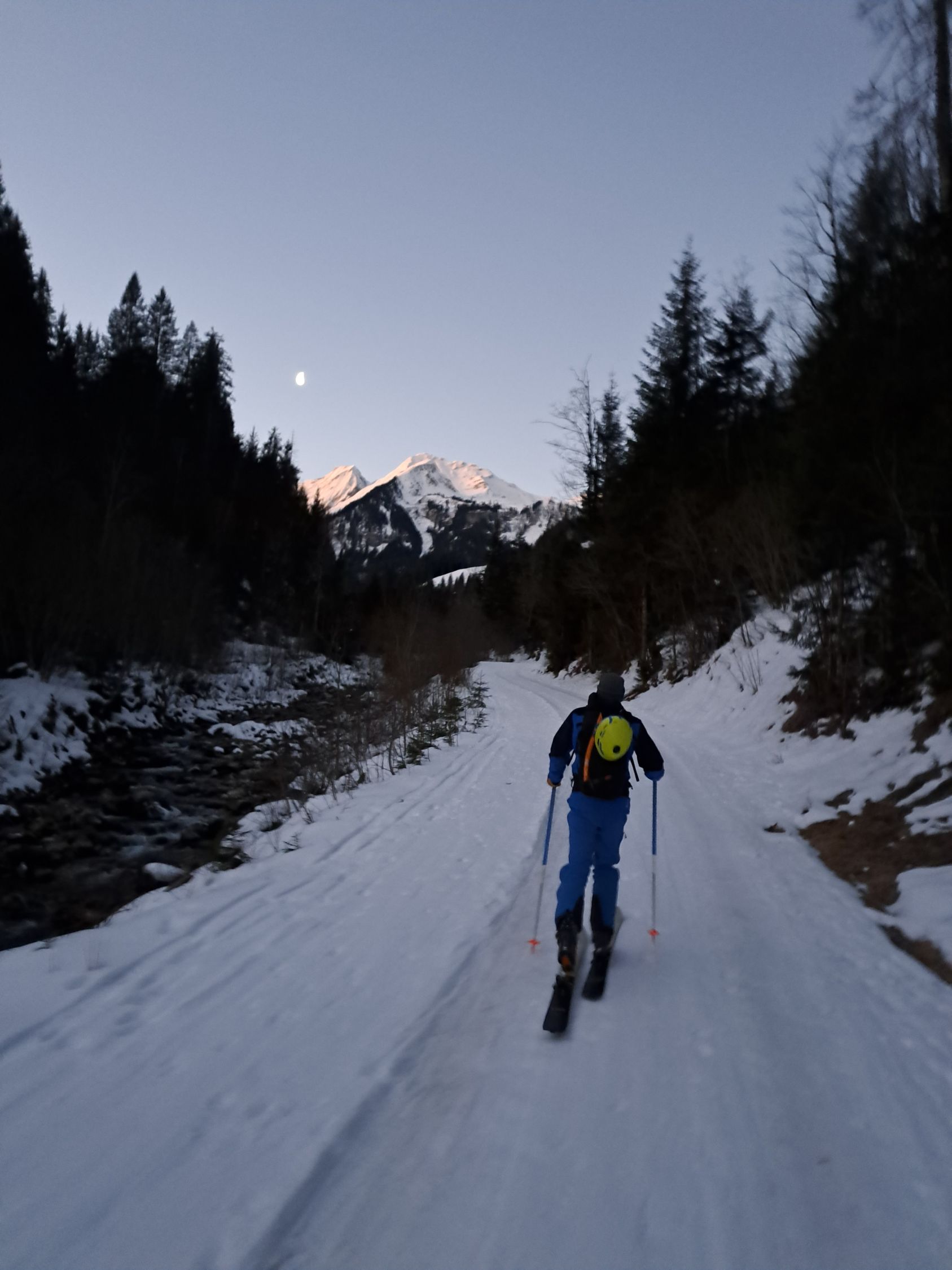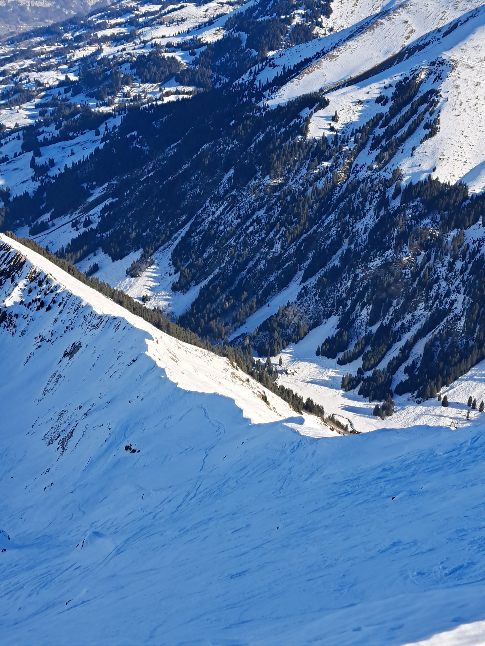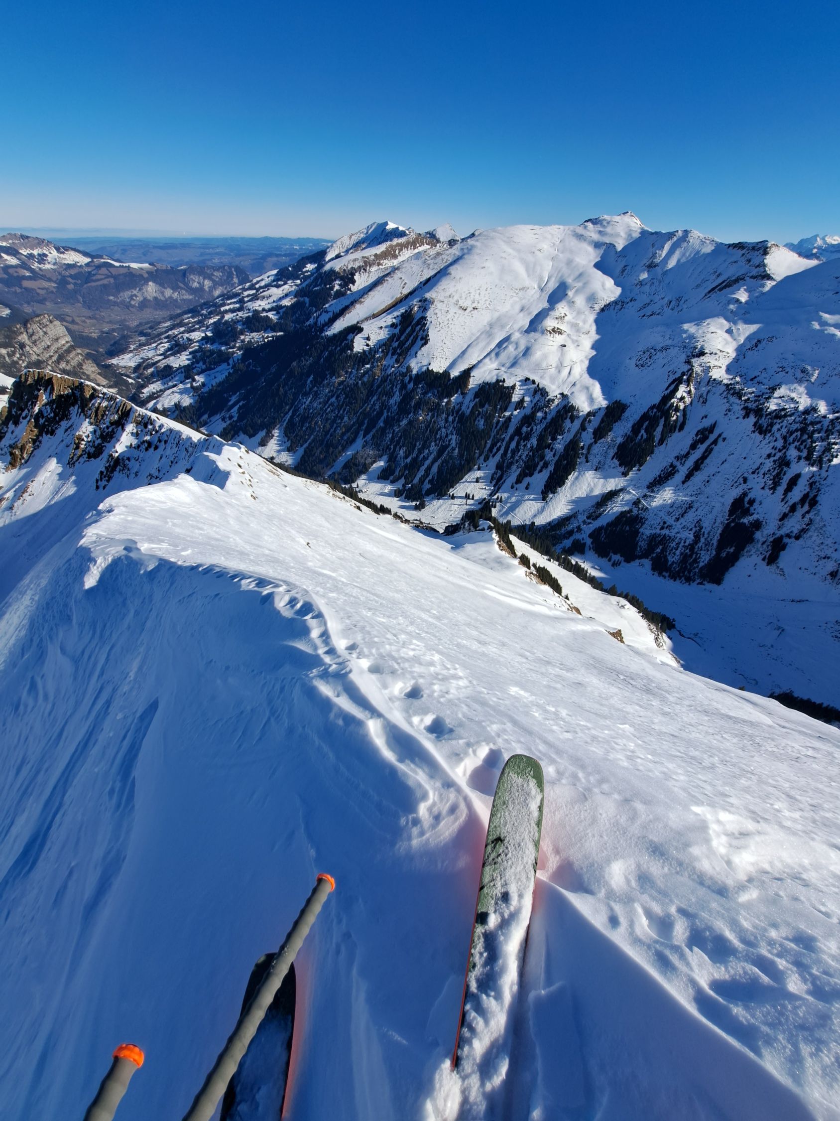 Aufstieg gespurt bis Gipfel,die letzden 50 hm zu Fuss.Abfahrt(10.30 Uhr) nordseitig des Grates (hart tragend) und Einfahrt Wand auf ca 2350 m..zu unserem Erstaunen null verfirnt nach all der sonnigen Tagen.etwas feuchter Pulver mit etwas Wind.aber schön und sicher zu fahren,unterer Teil sogar fluffi Pulver.Hang ob Alphütte schon sehr sulzig und heikel für Rutsche.Ausfahrtshang ganz rechts in Schatten in super Pulver.Strasse retour sehr gut zu fahren.